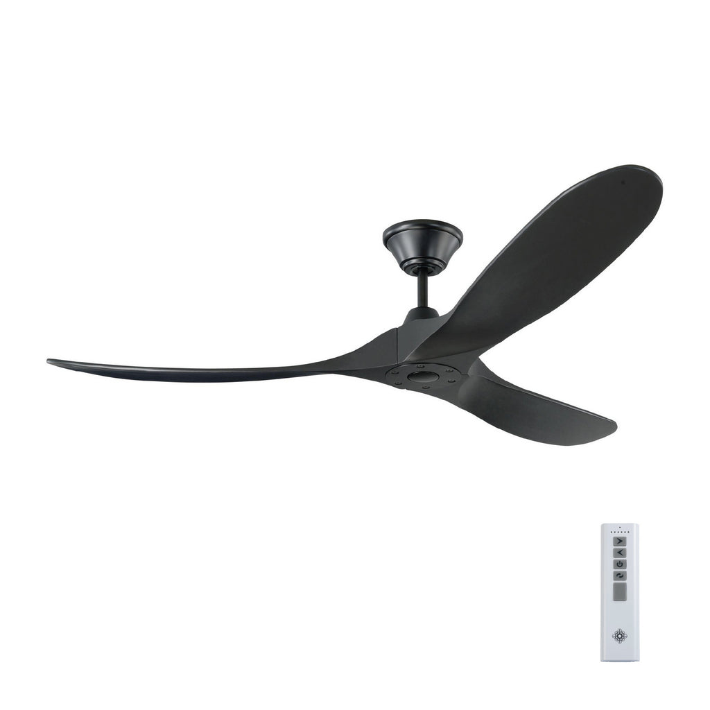The Maverick 60 in Matte Black w Matte Black Blades features an 85.0 X 28.0 6-speed motor with a Thirteen-degree blade pitch. With a sleek modern silhouette, a DC motor, and super energy-efficiency, the 60" Maverick ceiling fan features softly rounded blades and elegantly simple housing. Maverick has a 60-inch blade sweep and a 3-blade design that delivers a distinct profile and incredible airflow for living rooms, great rooms, or outdoor covered areas. It includes a hand-held remote with six speeds. It reverses and is available in six distinct finish options: Brushed Steel housing with Dark Walnut blades, Brushed Steel housing with Koa blades, Matte Black housing with Dark Walnut Blades, Aged Pewter housing with Light Grey Weathered Oak blades, Matte Black housing with Matte Black blades and Matte White housing with Matte White blades. All versions feature beautiful hand-carved balsa wood blades. ENERGY STAR qualified. Maverick fans are damp-rated and may be used indoors and in covered outdoor spaces.