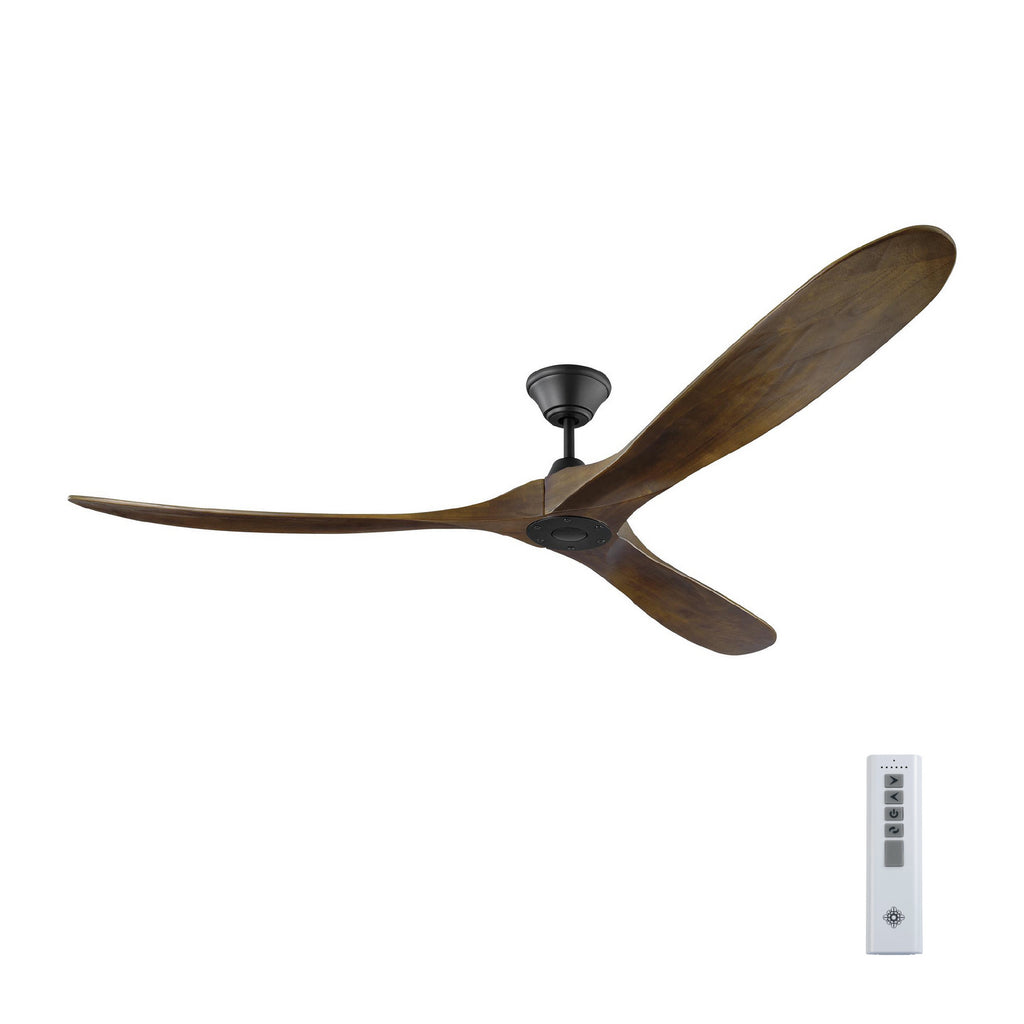 The Maverick 70 in Matte Black w Dark Walnut Blades features an 85.0 X 28.0 6-speed motor with a Thirteen-degree blade pitch. With a sleek modern silhouette, a DC motor, and super energy efficiency, the 70" Maverick Max ceiling fan features softly rounded blades and elegantly simple housing. Maverick Max features a 3-blade design that delivers a distinct profile and incredible airflow for living rooms, great rooms, or outdoor covered areas. It includes a hand-held remote with six speeds. It reverses and is available in six distinct finish options: Brushed Steel housing with Dark Walnut blades, Brushed Steel housing with Koa blades, Matte Black housing with Dark Walnut Blades, Aged Pewter housing with Light Grey Weathered Oak blades, Matte Black housing with Matte Black blades and Matte White housing with Matte White blades. All versions feature beautiful hand-carved balsa wood blades. ENERGY STAR qualified. Maverick fans are damp-rated and may be used indoors or in covered areas.