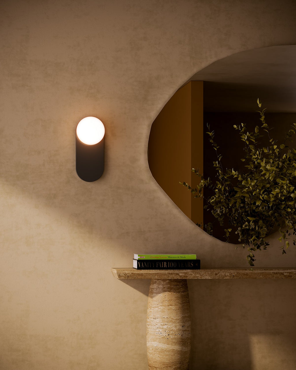 The Ariel sconce is a perfect blend of style and functionality. It's perfect for adding a touch of elegance to hallways, bathrooms, and commercial spaces. The pill-shaped metal accents and opal glass diffuser give it a modern look that's both stylish and practical.