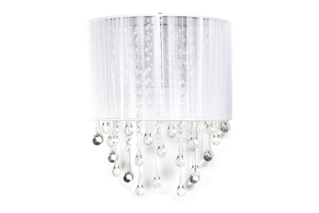 Bring a dramatic focal point to any area of your home with the unique round Beverly Dr. collection wall sconce's stunning style. Cut and polished crystals are held in place with stainless-steel rings and illuminated by brilliant halogen points of light and graced by a beautiful silk string shade.