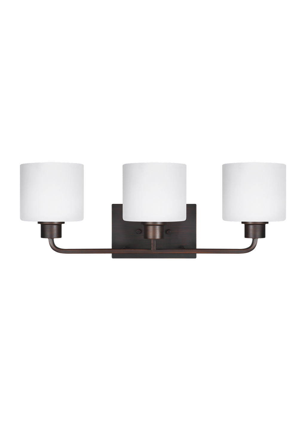 The Canfield three light vanity fixture in bronze offers shadow-free lighting in your powder room, spa, or master bath room. Behind every seemingly simple design lies unerring attention to restraint and obsessive attention to the tiniest details. The Canfield collection by draws on the modernist traditions of "less is more". Essential functional elements dictate the aesthetics, and clean lines prevail. Layers of intricately finished hand-brushed steel progress vertically to the soft glow of light diffused through finely etched glass diffusors. Canfield offers a "whole home" lighting solution, offering lighting in every imaginable category from the auspicious 15 light 3-tier chandelier, to the concise mini-pendant and one-light sconces. The collection is available in hand brushed Burnt Sienna for a warm, tactile, almost Craftsman design style, or a brushed nickel to emphasize the more architectural elements of your interior.