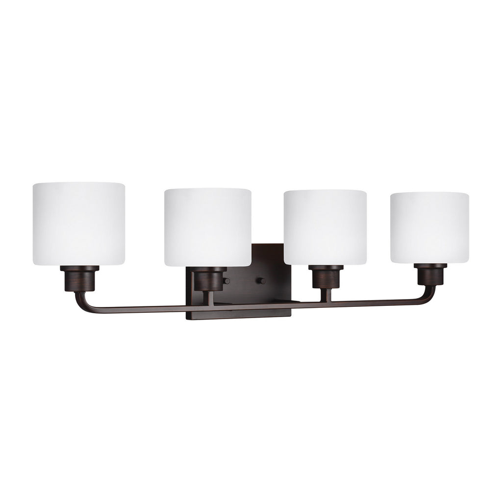 The Canfield four light vanity fixture in bronze offers shadow-free lighting in your powder room, spa, or master bath room. Behind every seemingly simple design lies unerring attention to restraint and obsessive attention to the tiniest details. The Canfield collection by draws on the modernist traditions of "less is more". Essential functional elements dictate the aesthetics, and clean lines prevail. Layers of intricately finished hand-brushed steel progress vertically to the soft glow of light diffused through finely etched glass diffusors. Canfield offers a "whole home" lighting solution, offering lighting in every imaginable category from the auspicious 15 light 3-tier chandelier, to the concise mini-pendant and one-light sconces. The collection is available in hand brushed Burnt Sienna for a warm, tactile, almost Craftsman design style, or a brushed nickel to emphasize the more architectural elements of your interior.