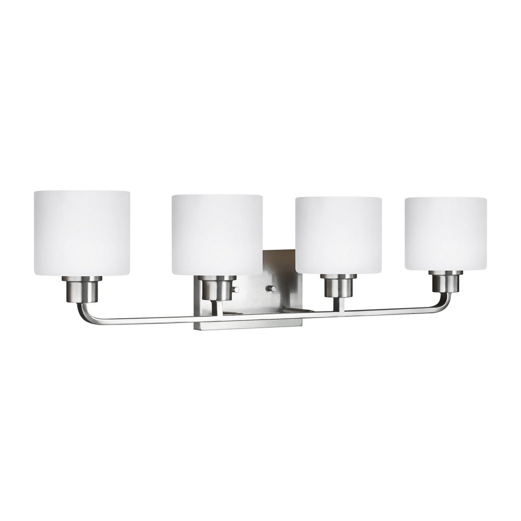 The Canfield four light vanity fixture in brushed nickel provides abundant light for your bath vanity, while adding a layer of today's style to your interior design. Behind every seemingly simple design lies unerring attention to restraint and obsessive attention to the tiniest details. The Canfield collection by draws on the modernist traditions of "less is more". Essential functional elements dictate the aesthetics, and clean lines prevail. Layers of intricately finished hand-brushed steel progress vertically to the soft glow of light diffused through finely etched glass diffusors. Canfield offers a "whole home" lighting solution, offering lighting in every imaginable category from the auspicious 15 light 3-tier chandelier, to the concise mini-pendant and one-light sconces. The collection is available in hand brushed Burnt Sienna for a warm, tactile, almost Craftsman design style, or a brushed nickel to emphasize the more architectural elements of your interior.