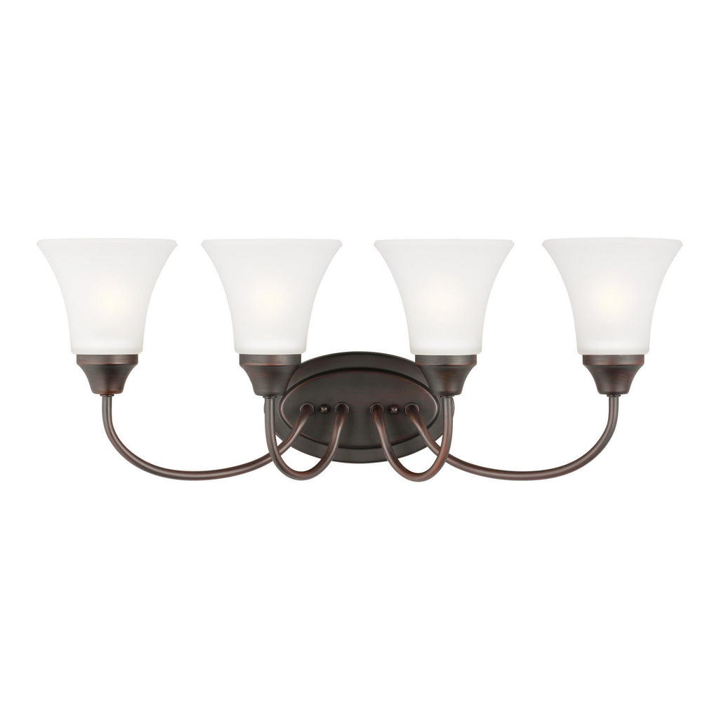 The Holman four light vanity fixture in bronze provides abundant light for your bath vanity, while adding a layer of today's style to your interior design. Holman features softly flared glass and curved arms, with just enough detail to give the overall look a lift while keeping it simple enough for those on a budget