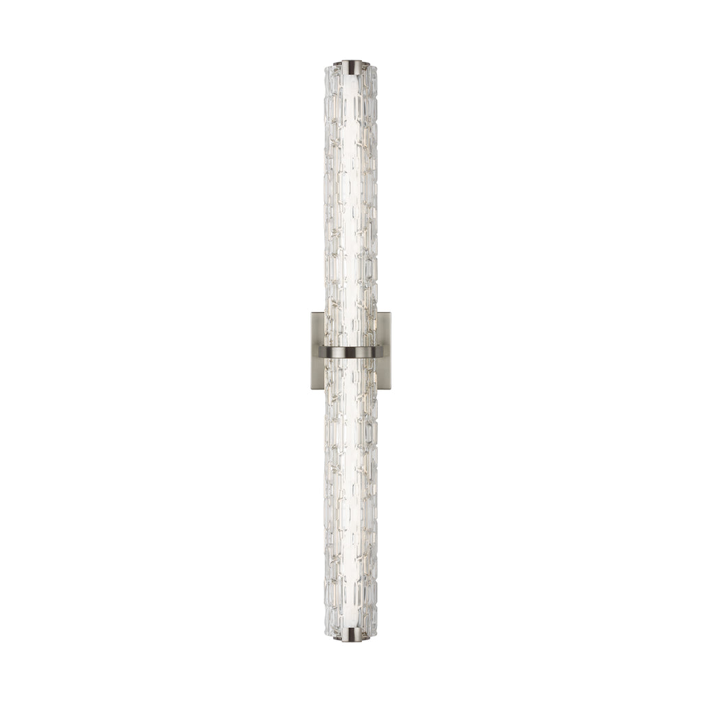 The Cutler one-light wall sconce in chrome offers shadow-free lighting in your powder room, spa, or main bathroom. The sleek linear profile of the Cutler Collection creates a perfect, contemporary backdrop for two unique glass options. Tiles of either Clear Crackle glass or Clear Staggered Rock glass are set in an organic version of a subway tile "look" and allow the LED light to shine through, adding rich sparkle to the room. Cutler is available in two finish options: Chrome and Satin Nickel.
