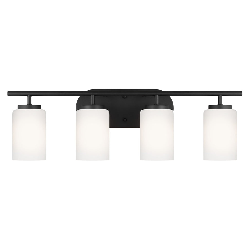 The Oslo four light vanity fixture in midnight black provides abundant light for your bath vanity, while adding a layer of today's style to your interior design. The Oslo lighting collection by is a sleek design, with smooth and clean lines. The Opal Etched glass adds to this collection's contemporary and minimalist character. Offered in Chrome, Brushed Nickel, Burnt Sienna and textured Blacksmith finishes, the collection includes nine-, five-, and three-light chandeliers, pendants in four sizes, both flush and semi-flush ceiling fixtures, as well as one-, two-, three- and four-light wall/bath fixtures. Both incandescent lamping and ENERGY STAR-qualified LED lamping are available. All fixtures are California Title 24 compliant.