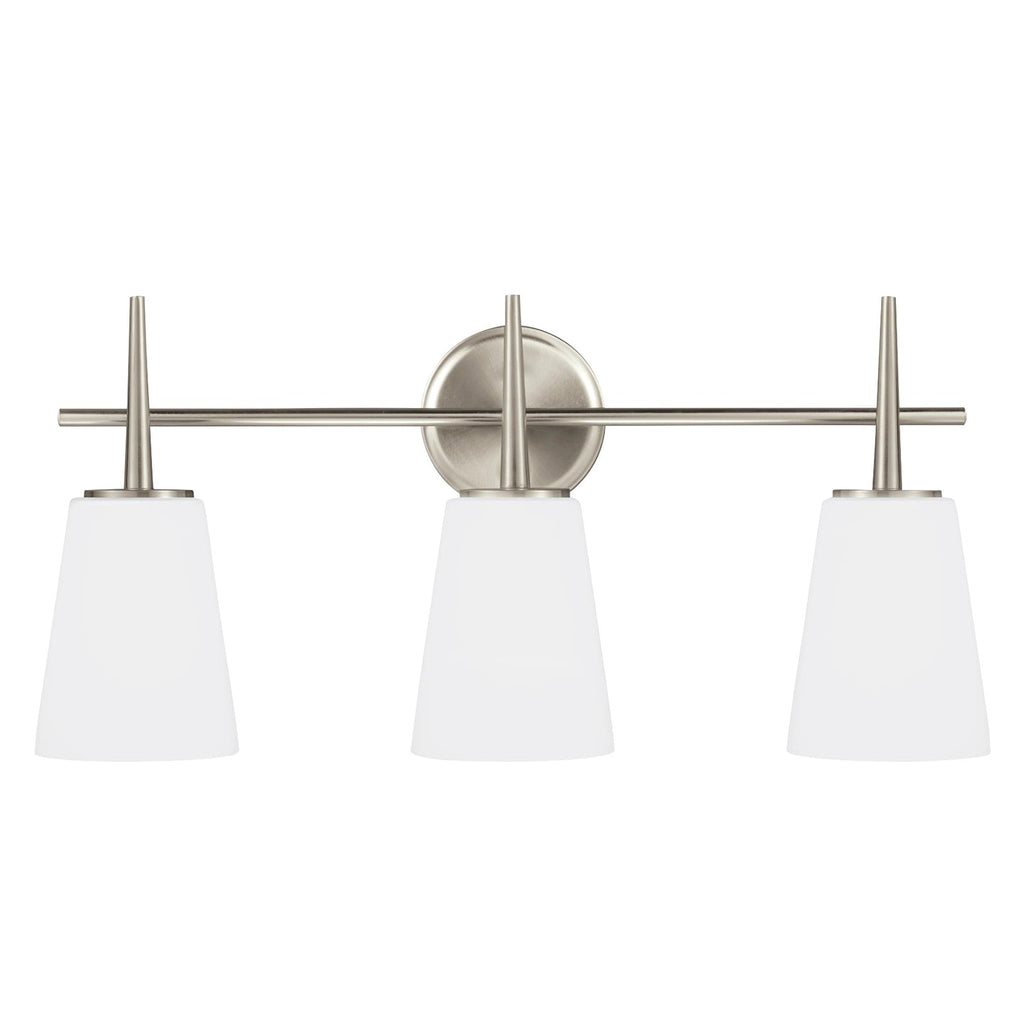 The Driscoll three light vanity fixture in brushed nickel is an ENERGY STAR qualified lighting fixture that uses LED bulbs to save you both time and money. The 1960âs-inspired Driscoll collection by features the clean lines of tapered stems and glass shades. Simplicity combined with sophistication creates this strikingly modern look. Offered in a Brushed Nickel finish in addition to the Chrome finish also offered for wall/bath fixtures all of which feature Etched White glass shades. The assortment includes nine-light, five-light and three-light chandeliers, a mini pendant, as well as one-light, two-light, three-light and four-light wall/bath fixtures. Both incandescent lamping and ENERGY STAR-qualified LED lamping are available, all fixtures are California Title 24 compliant.