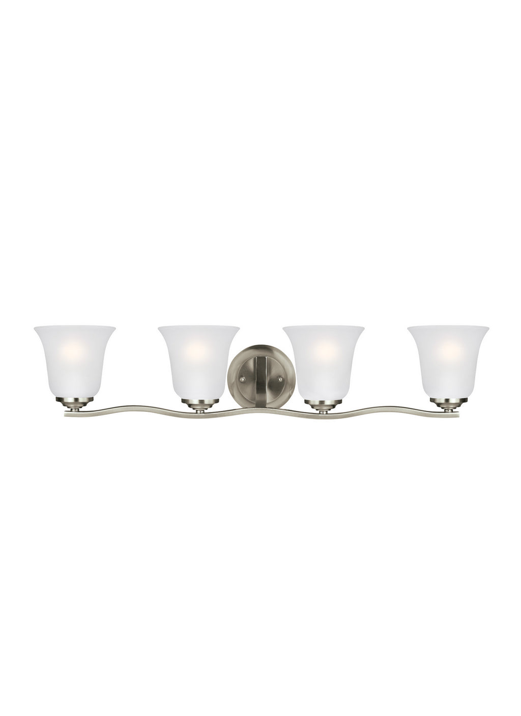 The Emmons four light vanity fixture in brushed nickel is an ENERGY STAR qualified lighting fixture that uses LED bulbs to save you both time and money. The Emmons lighting collection by combines form and function in a traditional empire silhouette. Trumpeted Satin Etched glass shades and a circular finial further enhance the design. Cluster three sizes together in a multi-fixture installation to make a beautifully dramatic statement in the living room, foyer, entryway or family room. The Emmons collection comes in two finishes: Brushed Nickel and Heirloom Bronze. Its assortment includes three-, five- and nine-light chandeliers, one-light mini pendant, three-light pendant, two-light semi-flush mount, one-light wall sconce, and two-, three- and four- light bath vanity fixtures. Incandescent and ENERGY STAR-qualified LED lamping are available, all fixtures are California Title 24 compliant.
