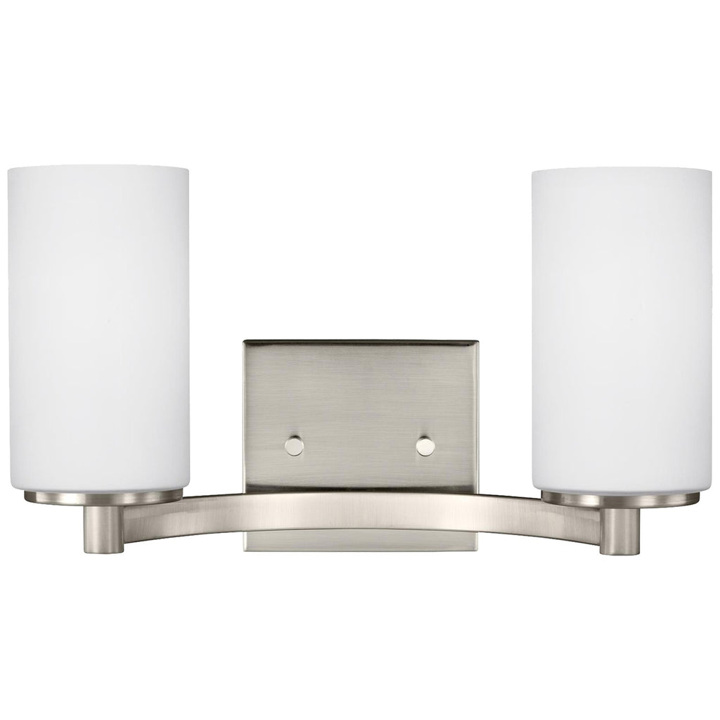 The Hettinger two light vanity fixture in brushed nickel is an ENERGY STAR qualified lighting fixture that uses LED bulbs to save you both time and money. The Hettinger lighting collection by combines a traditional look with chic, modern charm. The minimalism of the tubular glass shades balances with the unique, outward-curve of the semi-circular arm detail. It's available in three finishes - Burnt Sienna and Brushed Nickel for the whole collection, and Chrome for the bath vanities. The assortment includes six- and nine-light chandeliers, a one-light wall sconce, two-, three- and four-light bath vanity fixtures, a three-light pendant and two- light semi-flush convertible pendant. Incandescent and ENERGY STAR-qualified LED lamping are available, all fixtures are California Title 24 compliant.