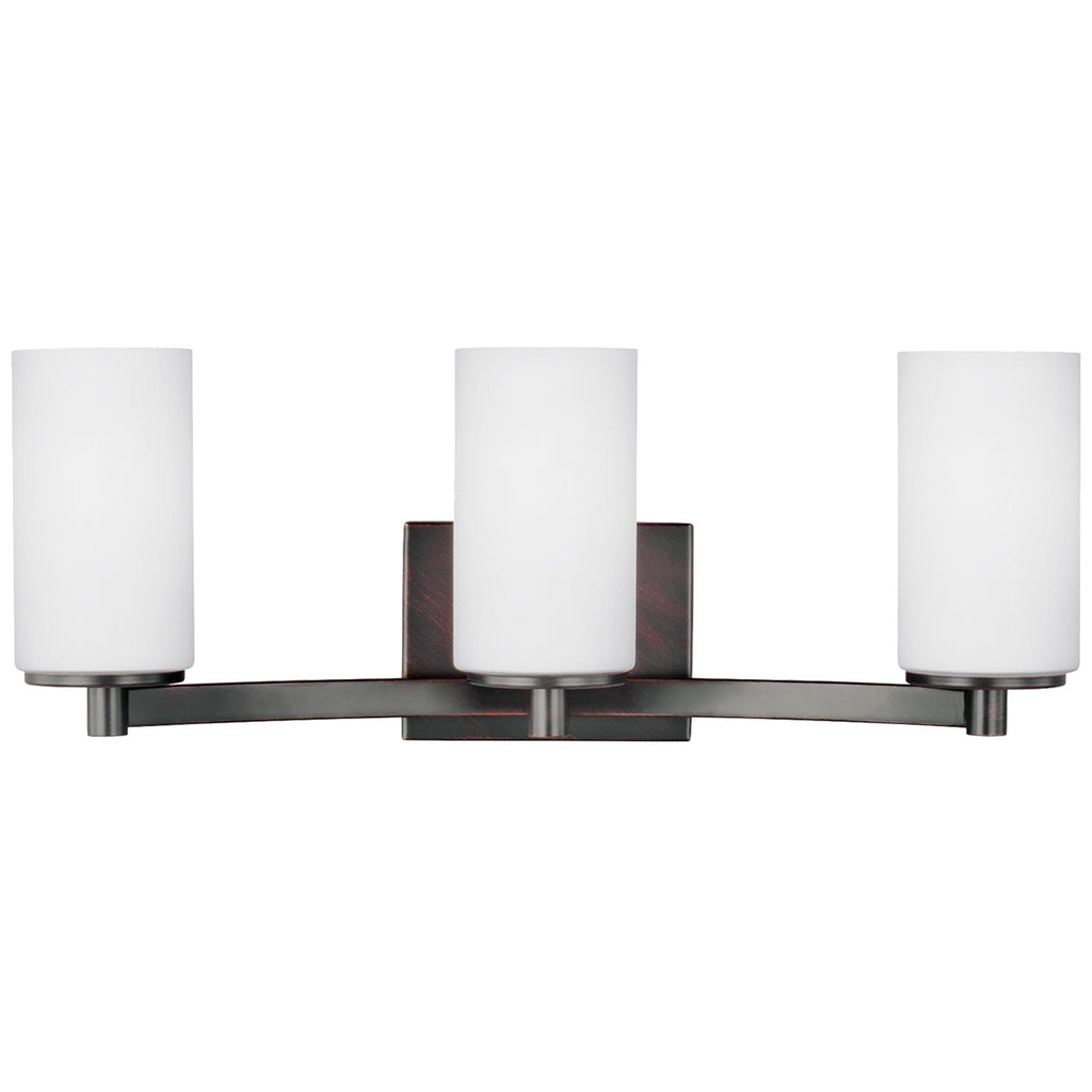 The Hettinger three light vanity fixture in bronze provides abundant light for your bath vanity, while adding a layer of today's style to your interior design. The Hettinger lighting collection by combines a traditional look with chic, modern charm. The minimalism of the tubular glass shades balances with the unique, outward-curve of the semi-circular arm detail. It's available in three finishes - Burnt Sienna and Brushed Nickel for the whole collection, and Chrome for the bath vanities. The assortment includes six- and nine-light chandeliers, a one-light wall sconce, two-, three- and four-light bath vanity fixtures, a three-light pendant and two- light semi-flush convertible pendant. Incandescent and ENERGY STAR-qualified LED lamping are available, all fixtures are California Title 24 compliant.