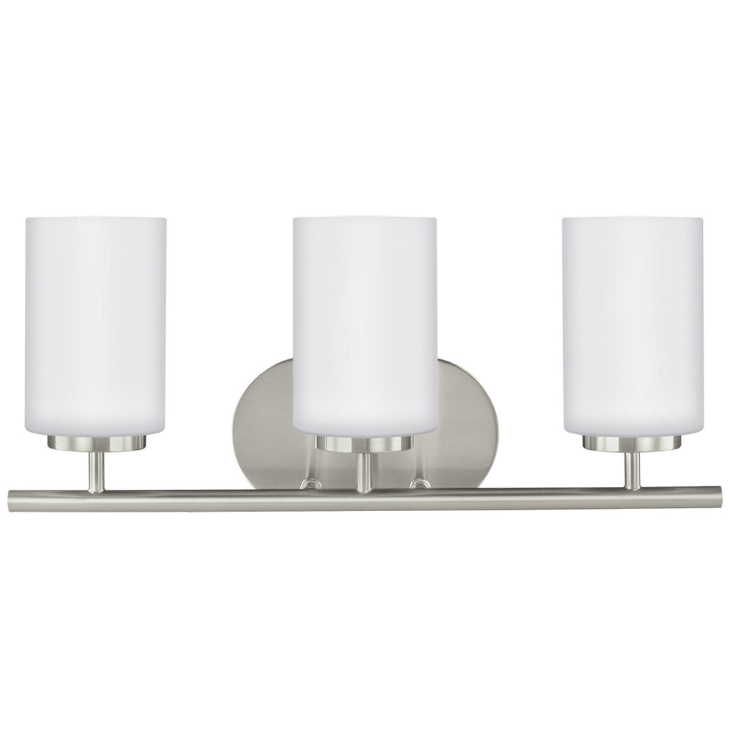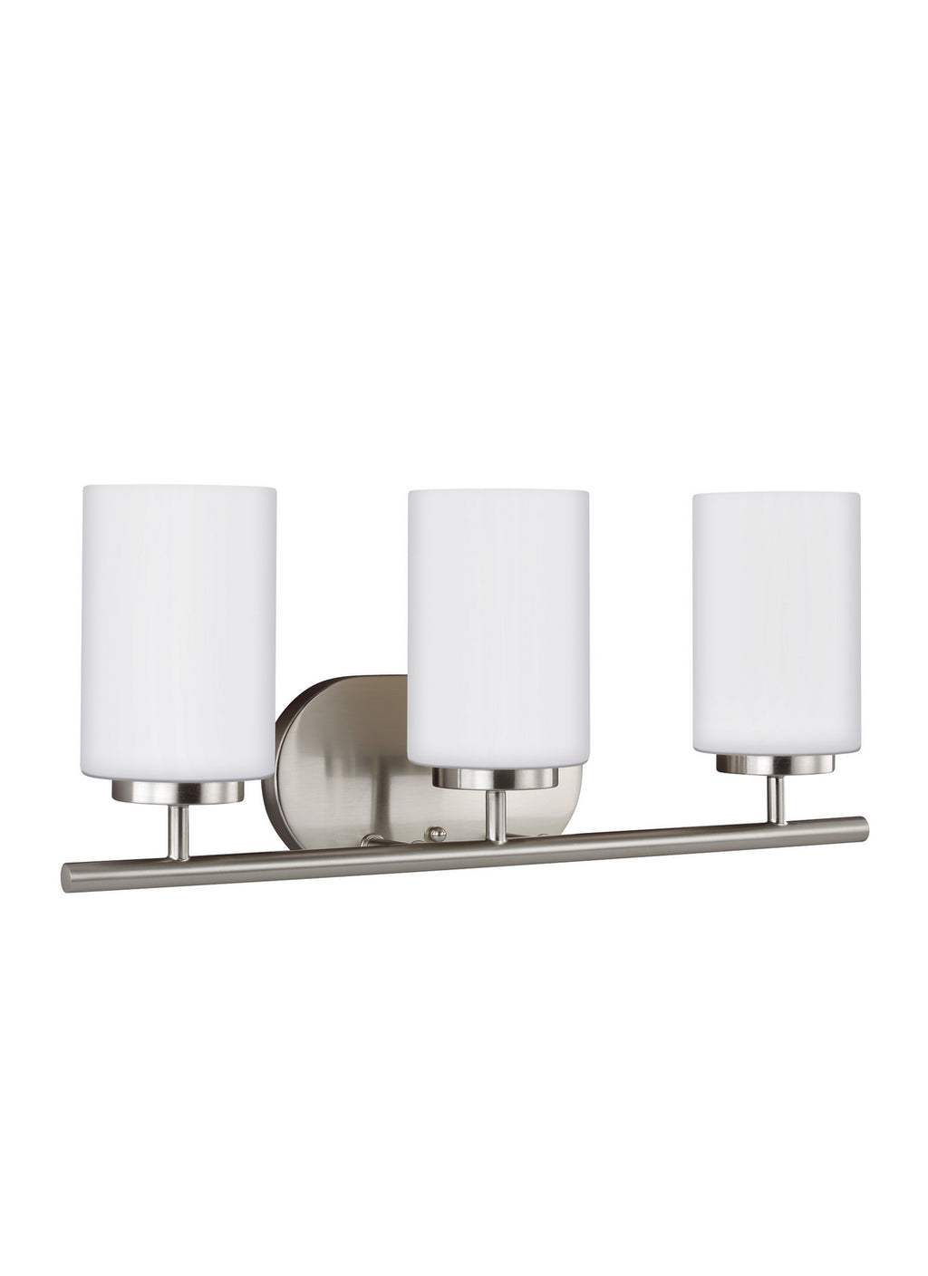 The Oslo three light vanity fixture in brushed nickel is an ENERGY STAR qualified lighting fixture that uses LED bulbs to save you both time and money. The Oslo lighting collection by is a sleek design, with smooth and clean lines. The Opal Etched glass adds to this collection's contemporary and minimalist character. Offered in Chrome, Brushed Nickel, Burnt Sienna and textured Blacksmith finishes, the collection includes nine-, five-, and three-light chandeliers, pendants in four sizes, both flush and semi-flush ceiling fixtures, as well as one-, two-, three- and four-light wall/bath fixtures. Both incandescent lamping and ENERGY STAR-qualified LED lamping are available. All fixtures are California Title 24 compliant.