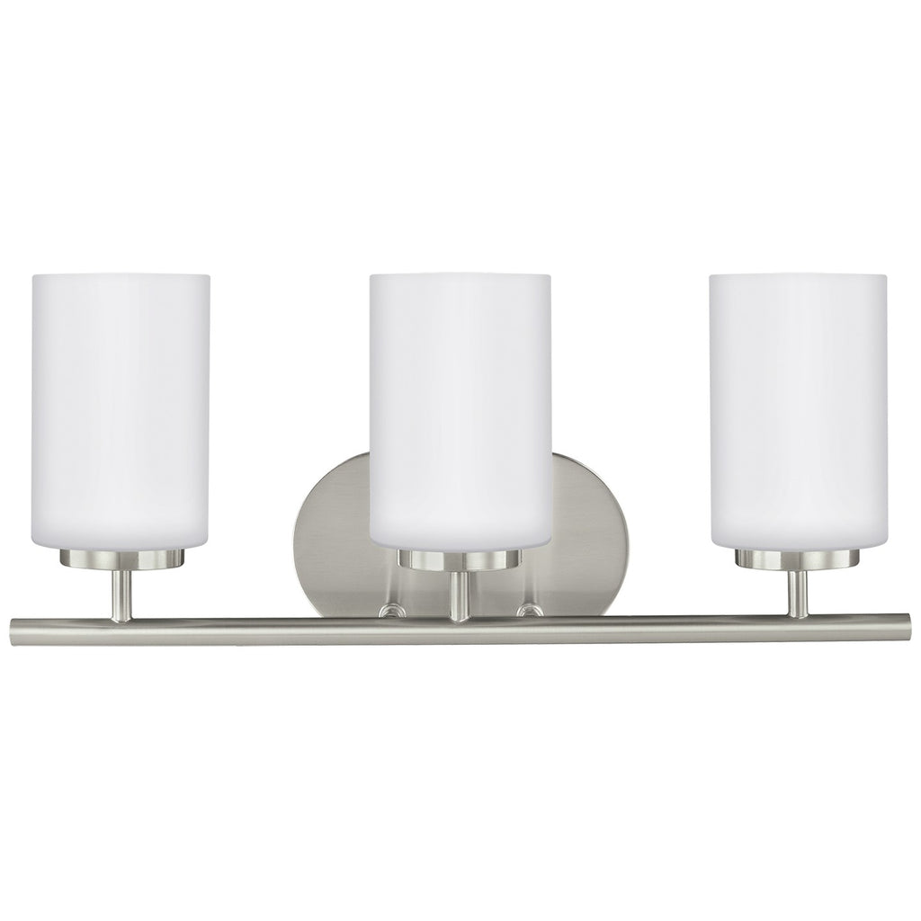 The Oslo three light vanity fixture in brushed nickel provides abundant light for your bath vanity, while adding a layer of today's style to your interior design. The Oslo lighting collection by is a sleek design, with smooth and clean lines. The Opal Etched glass adds to this collection's contemporary and minimalist character. Offered in Chrome, Brushed Nickel, Burnt Sienna and textured Blacksmith finishes, the collection includes nine-, five-, and three-light chandeliers, pendants in four sizes, both flush and semi-flush ceiling fixtures, as well as one-, two-, three- and four-light wall/bath fixtures. Both incandescent lamping and ENERGY STAR-qualified LED lamping are available. All fixtures are California Title 24 compliant.