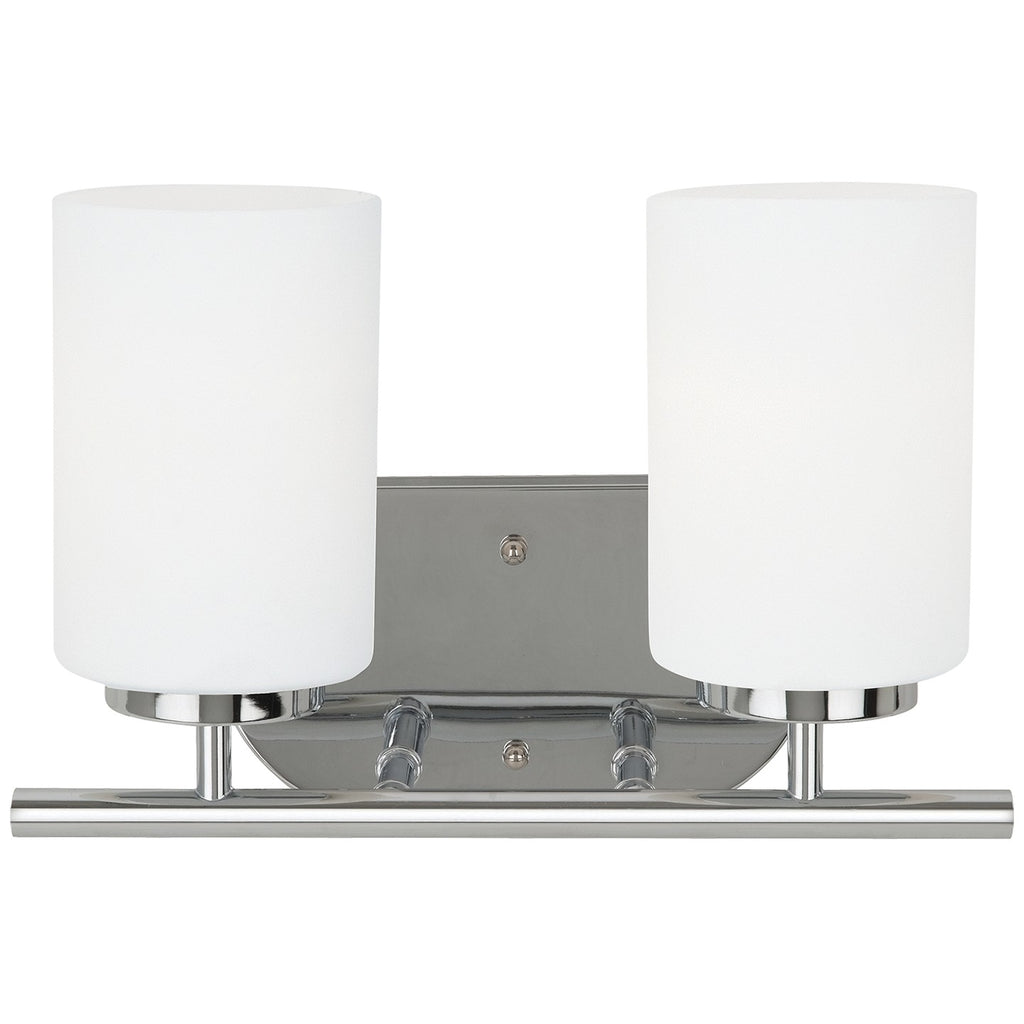 The Oslo two light vanity fixture in chrome is an ENERGY STAR qualified lighting fixture that uses LED bulbs to save you both time and money. The Oslo lighting collection by is a sleek design, with smooth and clean lines. The Opal Etched glass adds to this collection's contemporary and minimalist character. Offered in Chrome, Brushed Nickel, Burnt Sienna and textured Blacksmith finishes, the collection includes nine-, five-, and three-light chandeliers, pendants in four sizes, both flush and semi-flush ceiling fixtures, as well as one-, two-, three- and four-light wall/bath fixtures. Both incandescent lamping and ENERGY STAR-qualified LED lamping are available. All fixtures are California Title 24 compliant.