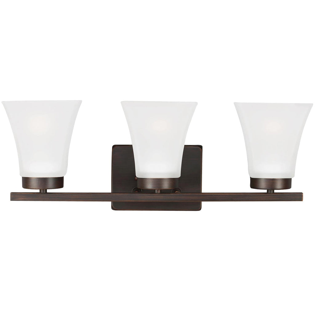 The Bayfield three light vanity fixture in bronze is an ENERGY STAR qualified lighting fixture that uses LED bulbs to save you both time and money. The Bayfield bath collection by delivers simplicity with flair. The transitional design is a subtle combination of clean lines and flared, angular Satin Etched glass shades to bring style and warmth to the bathroom no matter the budget. Offered in Chrome, Burnt Sienna and Brushed Nickel finishes, the bath lighting collection offers one-light, two-light, three-light and four-light vanity fixtures. Both incandescent lamping and ENERGY STAR-qualified LED lamping are available, all fixtures are California Title 24 compliant.