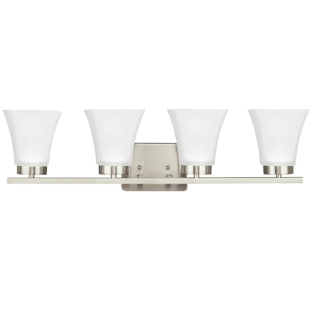 The Bayfield four light vanity fixture in brushed nickel is an ENERGY STAR qualified lighting fixture that uses LED bulbs to save you both time and money. The Bayfield bath collection by delivers simplicity with flair. The transitional design is a subtle combination of clean lines and flared, angular Satin Etched glass shades to bring style and warmth to the bathroom no matter the budget. Offered in Chrome, Burnt Sienna and Brushed Nickel finishes, the bath lighting collection offers one-light, two-light, three-light and four-light vanity fixtures. Both incandescent lamping and ENERGY STAR-qualified LED lamping are available, all fixtures are California Title 24 compliant.