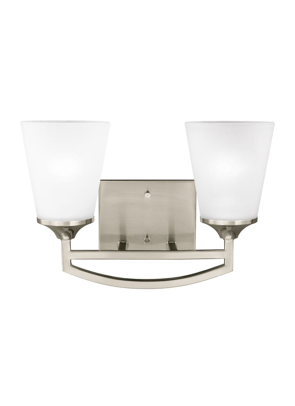 The Hanford two light vanity fixture in brushed nickel provides abundant light for your bath vanity, while adding a layer of today's style to your interior design. The transitional styling of the Hanford lighting collection by is evident in its elegant symmetry articulated by long, sweeping arms. Tapered Etched glass shades produce a soft up light and make Hanford complementary to a wide array of decor from traditional to contemporary. Offered in both Brushed Nickel and Burnt Sienna finishes, the collection includes five-, nine- and fifteen-light chandeliers, a three-light hall/foyer light, a one-light mini pendant, a three-light pendant, a three-light semi-flush mount which can convert into a pendant, and one-, two-, three- and four-light bath fixtures. Incandescent and ENERGY STAR-qualified LED lamping are available, all fixtures are California Title 24 compliant.