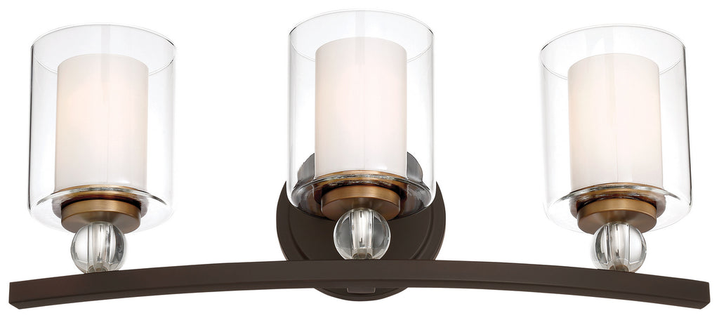 3 Light Bath in Painted Bronze with Natural Brushed Brass Clear Glass with Removable Interior Etched White Glass