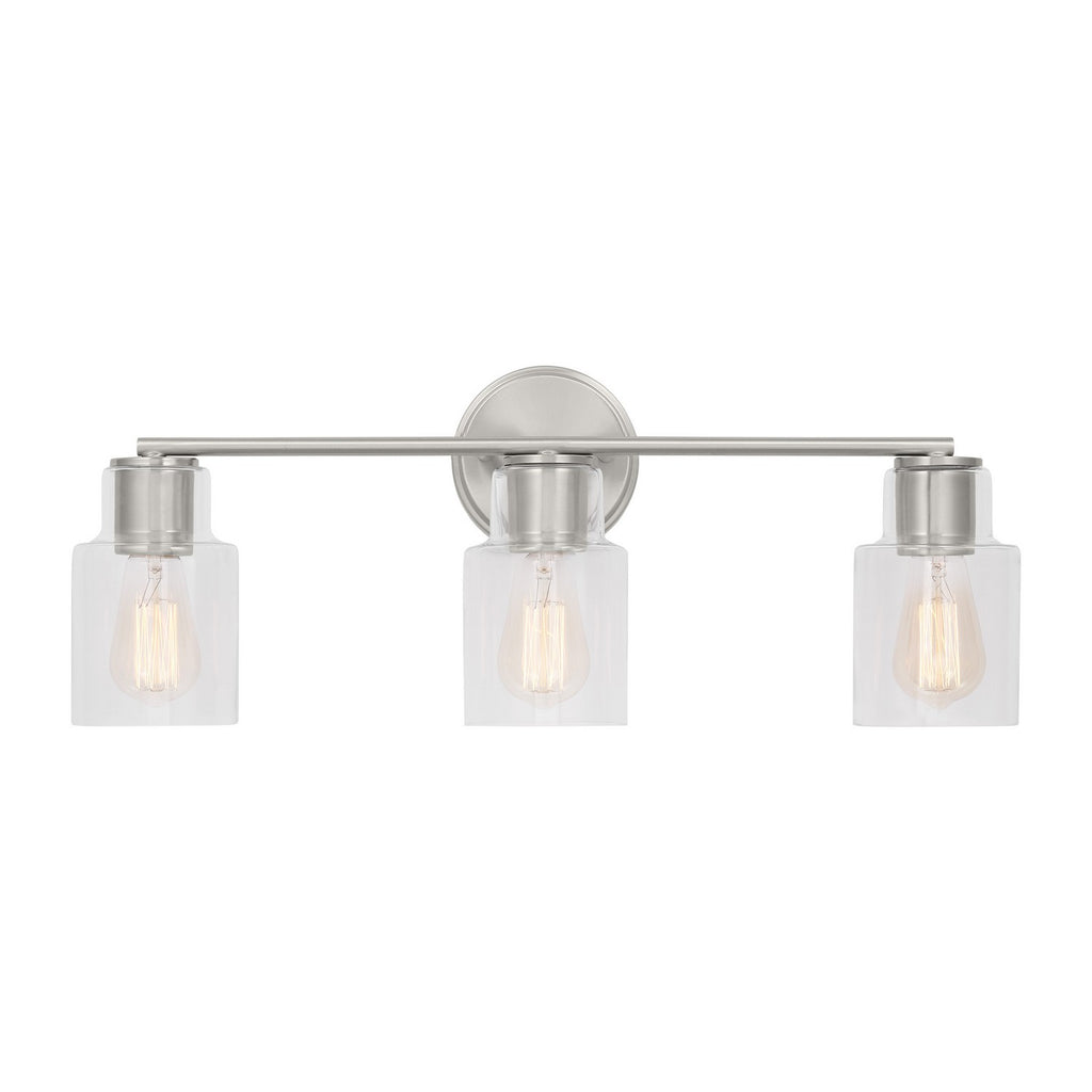 Add a bright burst of light where you need it most with the classic Drew & Jonathan Sayward Three Light Wall / Bath Sconce, featuring a round metal backplate and clear glass shades. Made to coordinate across a broader range of bath hardware and design styles, the Sayward is available in four popular finishes, Brushed Steel, Chrome, Midnight Black, and Satin Brass. This light looks great on its own or installed above a bathroom vanity, and the glass shades make it ideal for filament bulbs. This fixture may be mounted in the up or down position, and is cETL listed for damp locations, making it the perfect lighting solution for any space.