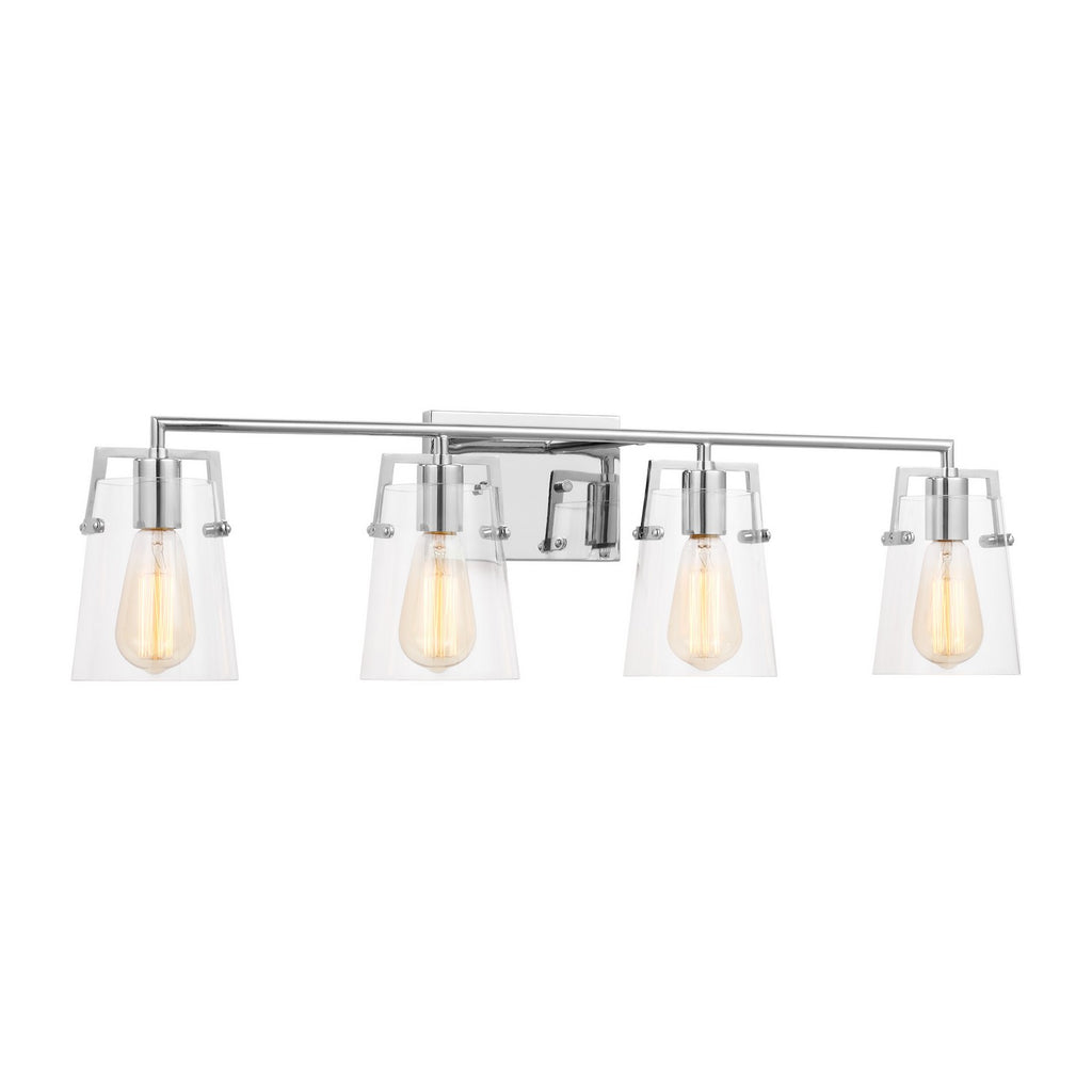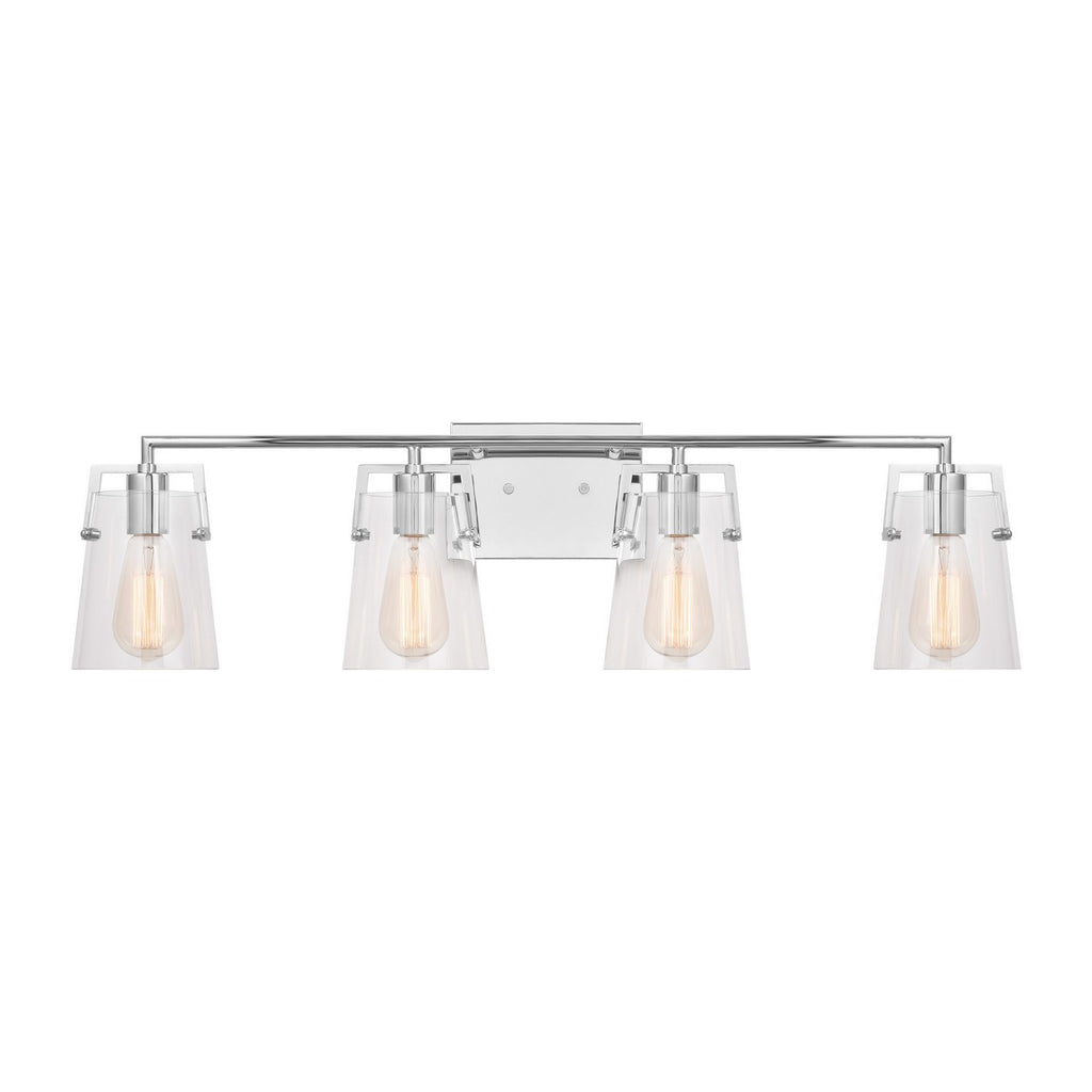Add a bright burst of light where you need it most with the stylish Drew & Jonathan Crofton Four Light Wall / Bath Sconce, featuring a sleek rectangular metal backplate and clear glass shades. Made to coordinate across a broader range of bath hardware and design styles, the Crofton is available in four popular finishes, Brushed Steel, Chrome, Midnight Black, and Satin Brass. This light looks great on its own or installed above a bathroom vanity, and the glass shades make it ideal for filament bulbs. This fixture may be mounted in the up or down position, and is cETL listed for damp locations, making it the perfect lighting solution for any space.