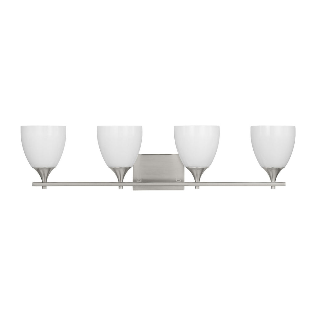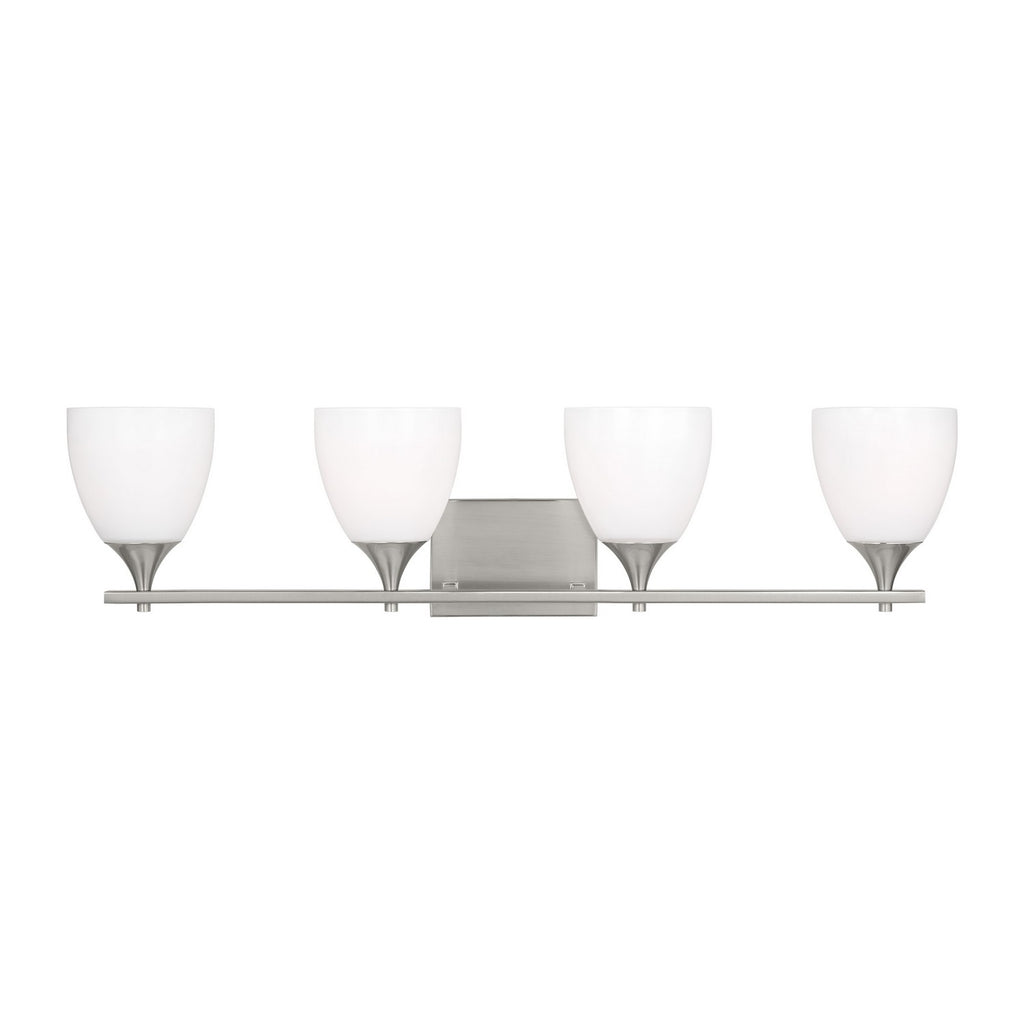 A modern take on a classic design, the Drew & Jonathan Toffino Four Light Wall / Bath Sconce breathes new life to its traditional shape with milk glass shades and striking, modern finishes. Made to coordinate across a broader range of bath hardware, the Toffino is available in four popular finishes, Brushed Steel, Chrome, Midnight Black, and Satin Brass, and looks great on its own or installed above a bathroom vanity. This fixture may be mounted in the up or down position, and is cETL listed for damp locations, making it the perfect lighting solution for any space.