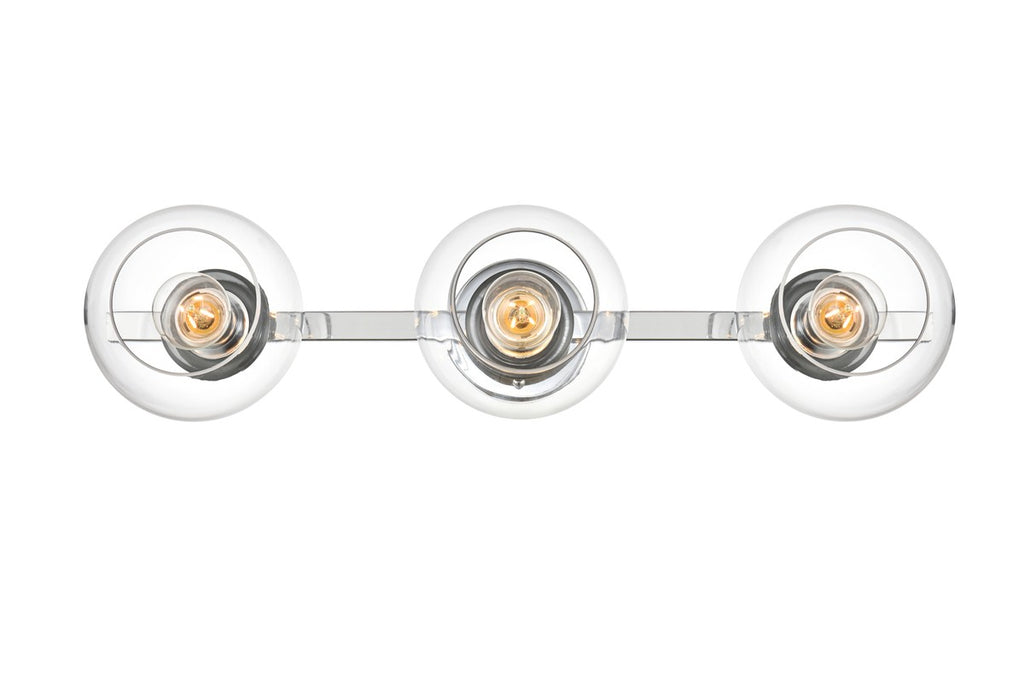 Turn up the brightness in your bathroom with this modern vanity light. This iron fixture features a streamlined silhouette and a smooth finish for a mid-century modern look. The circular backplate connects to one sleek arm design. The arm holds clear glass globe shades that accommodate medium-base bulb up to 40W, which are not included.