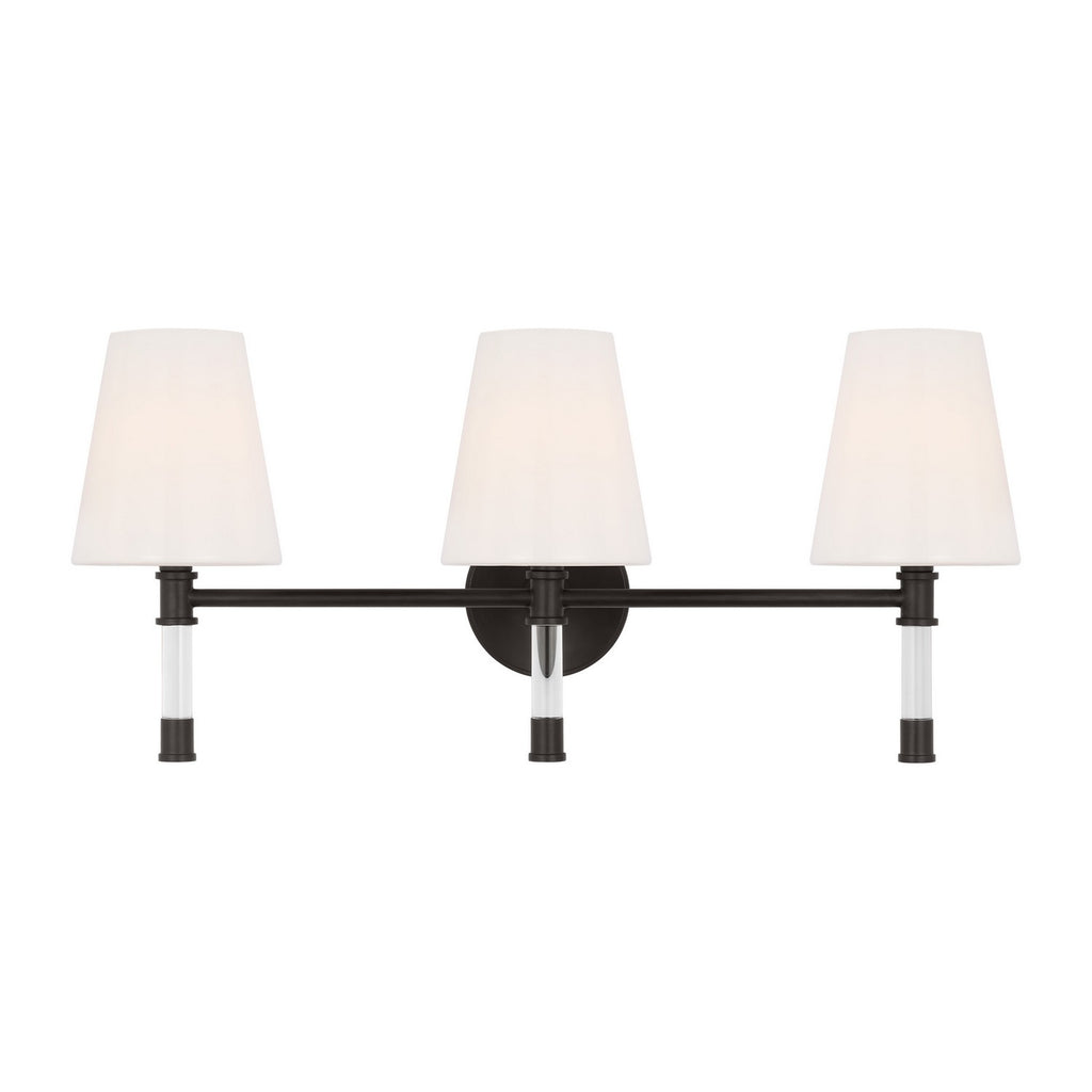 In the Hanover three-light wall vanity, Lucite arms form an elegant, dynamic silhouette that stems from a hub of either Burnished Brass and Polished Nickel finish and extends to matching color candle tubes, topped with exposed candelabra bulbs. Round backplate.