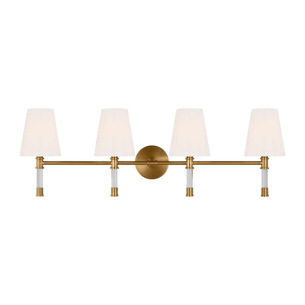 In the Hanover three-light wall vanity, Lucite arms form an elegant, dynamic silhouette that stems from a hub of either Burnished Brass and Polished Nickel finish and extends to matching color candle tubes, topped with exposed candelabra bulbs. Round backplate.
