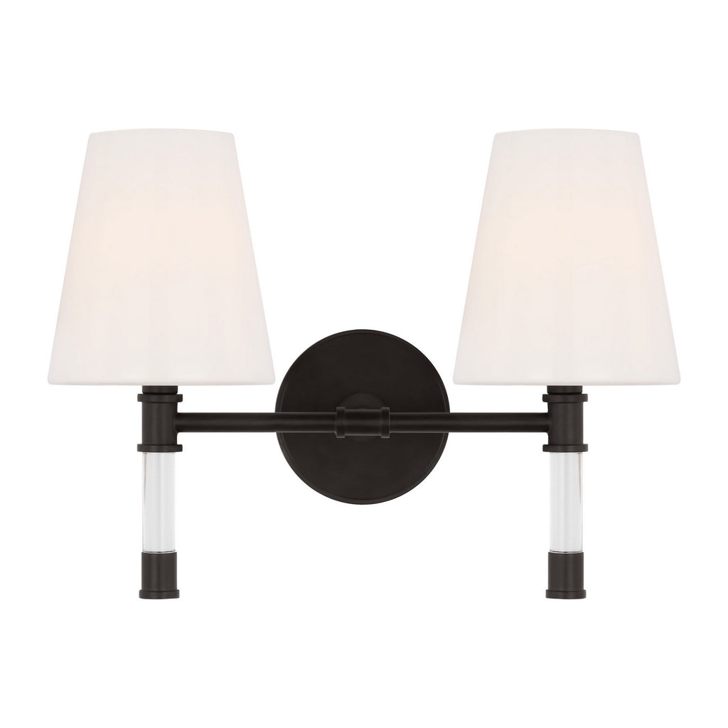 In the Hanover two-light wall vanity, Lucite arms form an elegant, dynamic silhouette that stems from a hub of either Burnished Brass and Polished Nickel finish and extends to matching color candle tubes, topped with exposed candelabra bulbs. Round backplate.
