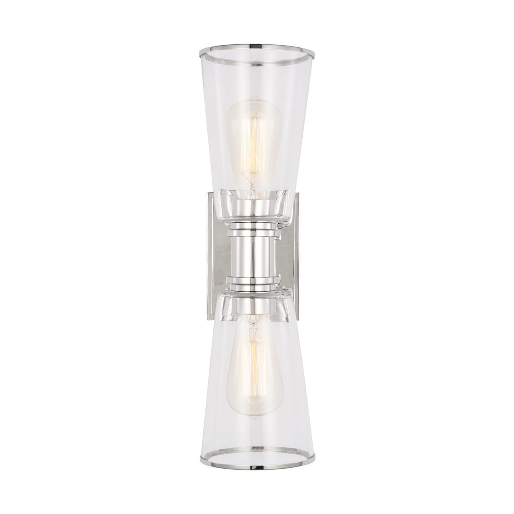 Designed by Chapman & Myers, the Alessa two light wall sconce in polished nickel is a Simple glass bathroom collection with rectangular metal arms and tapered clear glass shades. The conical clear glass shades replicate and frame the shape of the inner filament bulb. Each shade is supported by a rectangular metal arm and is capped with a thin metal rim.