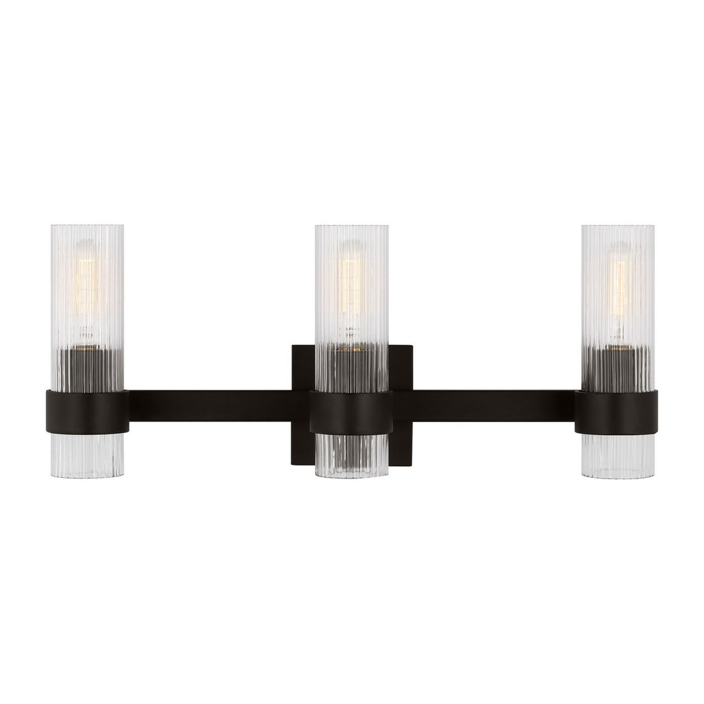 Designed by Chapman & Myers, the Geneva three-light vanity fixture in Aged Iron offers shadow-free lighting in your powder room, spa, or master bath. It is the perfect way to achieve your home's desired fashion or functional needs. A fluted shade forms an elegant, dynamic silhouette balanced by a strong frame of Aged Iron, Burnished Brass, or Polished Nickel.