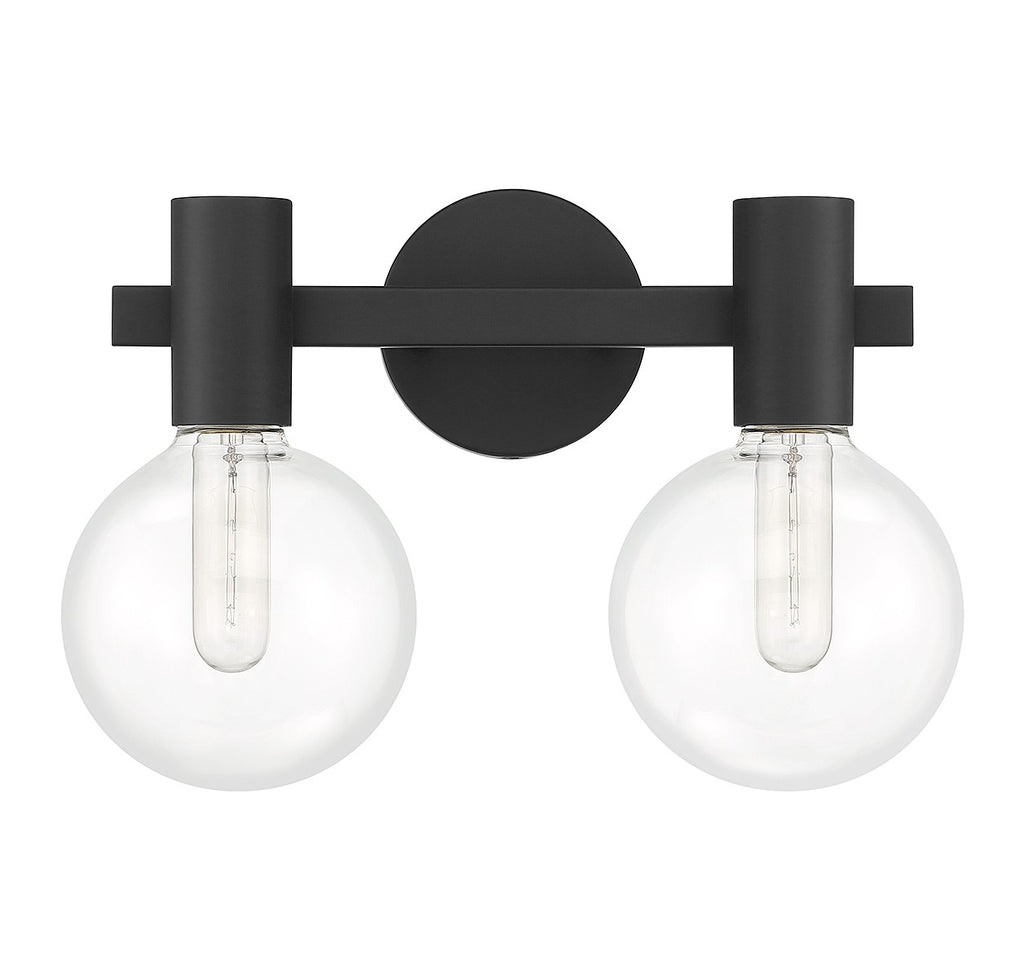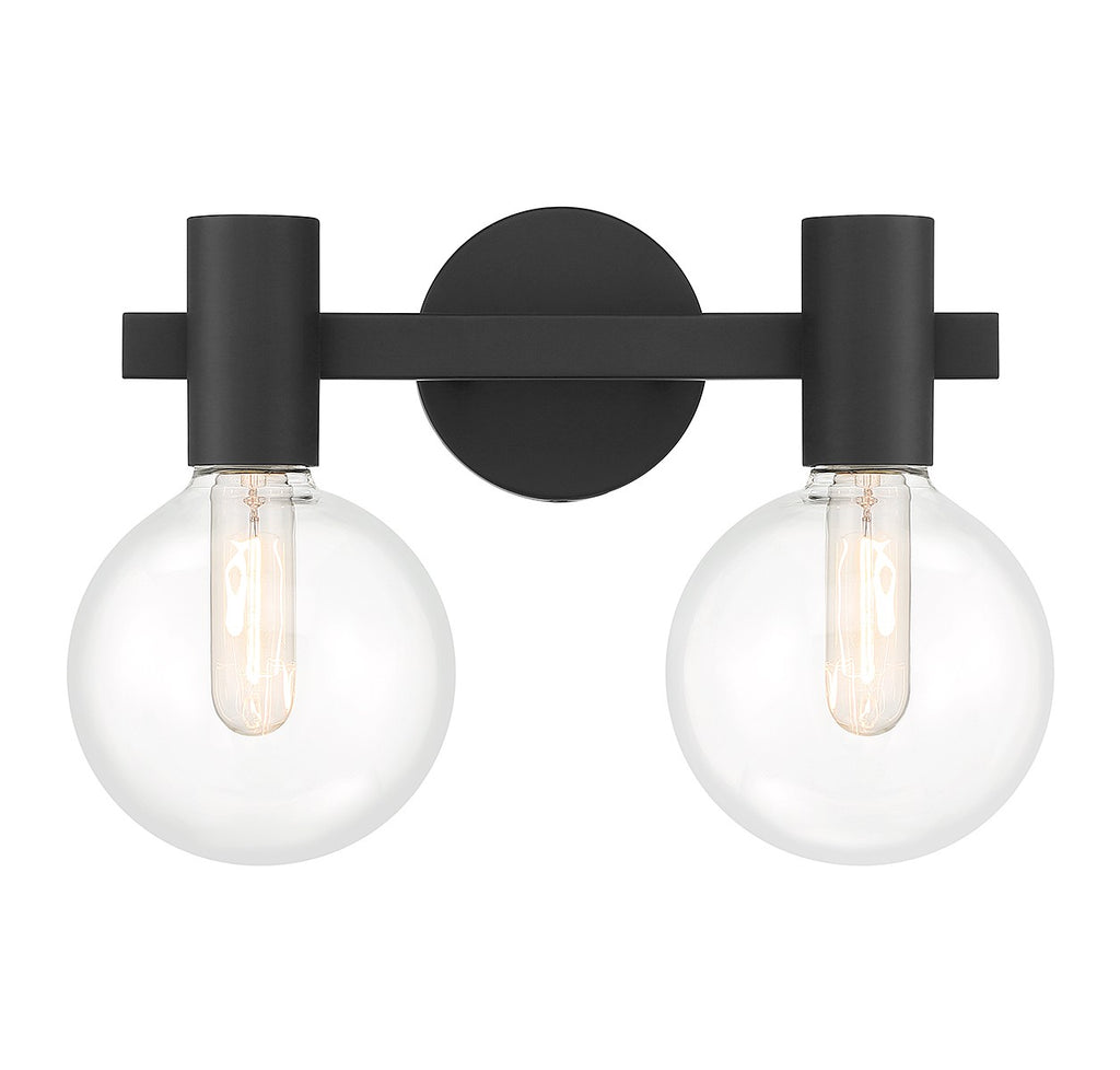 This Savoy House Wright 2-light bath vanity light showcases streamlined style that makes it ideal for any bathroom. Round clear glass shades add an extra dimension and extra protection for the light bulbs within. Matte black finish. Wright is 15.5" in width, 10" in height and extends 7.5" from the wall. Uses 2 standard size bulbs of up to 60 watts per bulb (bulbs not included). We recommend using tubular shaped bulbs.