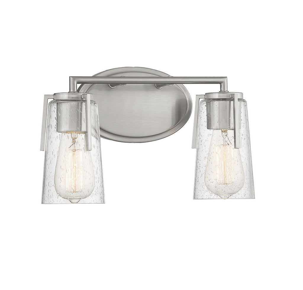 A clean, streamlined design with clear seeded glass shades defines the Sacremento collection. Measuring 14" wide.5" high and extending 5.38" from the wall, this two-light bath bar in a satin nickel finish provides ample illumination from two 60-watt standard size bulbs.