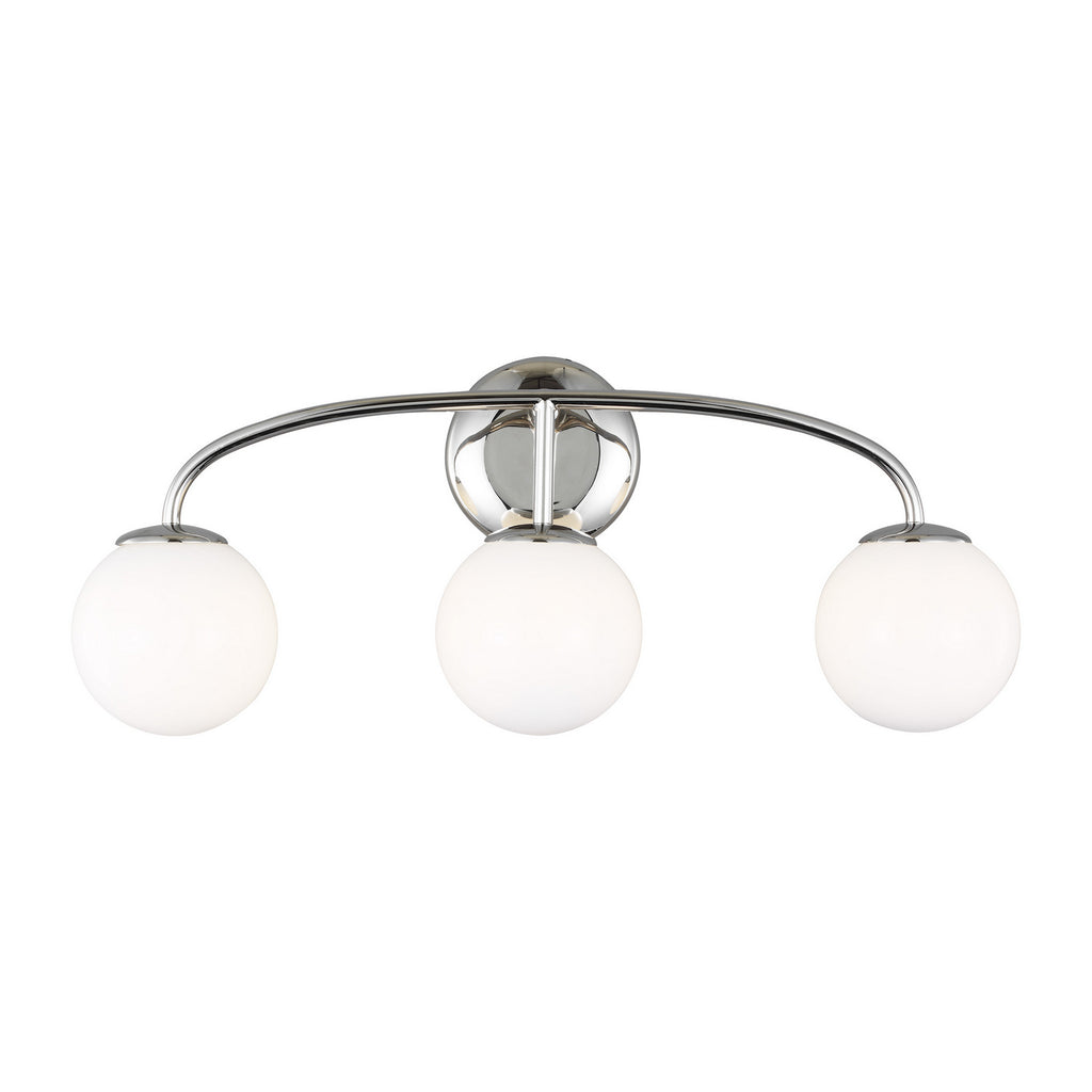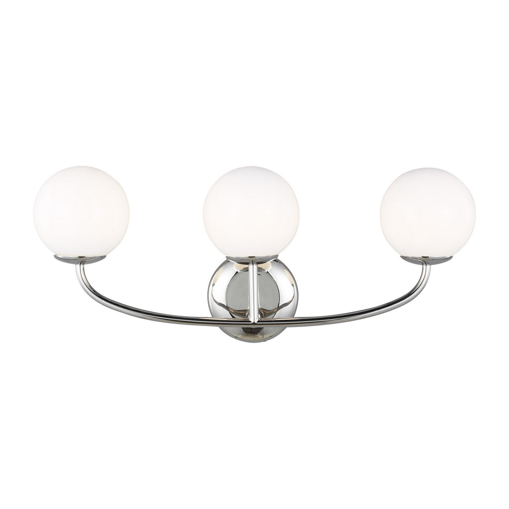 The Galassia three light wall sconce in polished nickel perfectly balances a glass globe and curving teardrop frame, giving it a contemporary look. The white glass casts a soft, welcoming glow over a space. This piece works particularly well in a hallway.