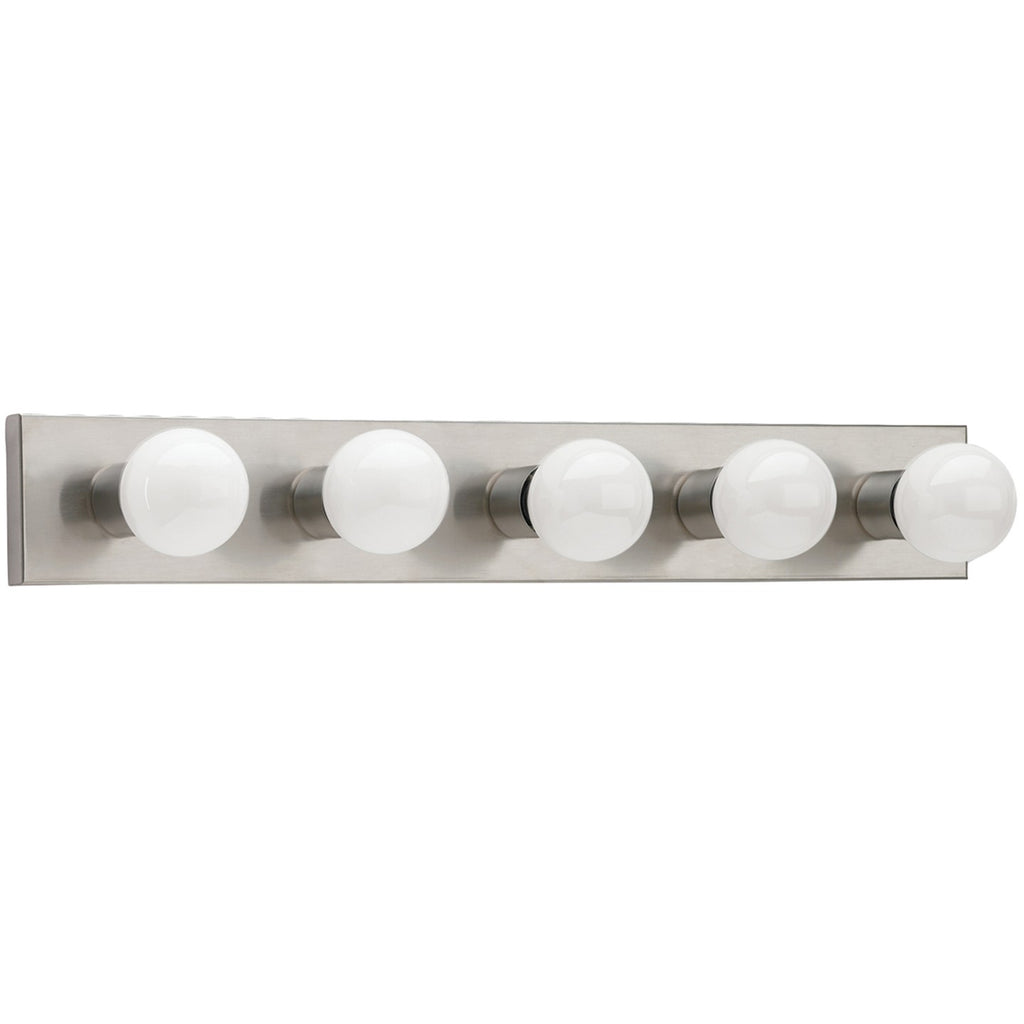 The Center Stage five light vanity bar fixture in brushed stainless offers shadow-free lighting in your powder room, spa, or master bath room. Center Stage bath and dressing room lighting by provides generous illumination with few shadows. Center Stage brings the style of Hollywood dressing rooms to your home and provides generous illumination for getting ready! Offered in Chrome or Brushed Stainless finishes, the assortment includes three-light, four-light, five-light, six-light and eight-light vanity fixtures. Fixtures are Damp rated, California Title 24 compliant and easily convert to LED by purchasing LED lamps sold separately.