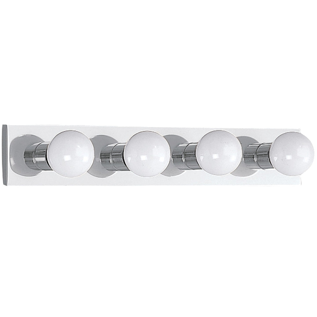 The Center Stage four light vanity bar fixture in chrome provides abundant light for your bath vanity, while adding a layer of today's style to your interior design. Center Stage bath and dressing room lighting by provides generous illumination with few shadows. Center Stage brings the style of Hollywood dressing rooms to your home and provides generous illumination for getting ready! Offered in Chrome or Brushed Stainless finishes, the assortment includes three-light, four-light, five-light, six-light and eight-light vanity fixtures. Fixtures are Damp rated, California Title 24 compliant and easily convert to LED by purchasing LED lamps sold separately.