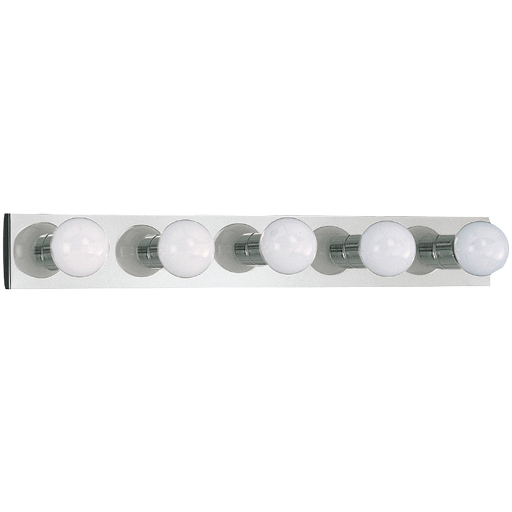 The Center Stage five light vanity bar fixture in chrome provides abundant light for your bath vanity, while adding a layer of today's style to your interior design. Center Stage bath and dressing room lighting by provides generous illumination with few shadows. Center Stage brings the style of Hollywood dressing rooms to your home and provides generous illumination for getting ready! Offered in Chrome or Brushed Stainless finishes, the assortment includes three-light, four-light, five-light, six-light and eight-light vanity fixtures. Fixtures are Damp rated, California Title 24 compliant and easily convert to LED by purchasing LED lamps sold separately.