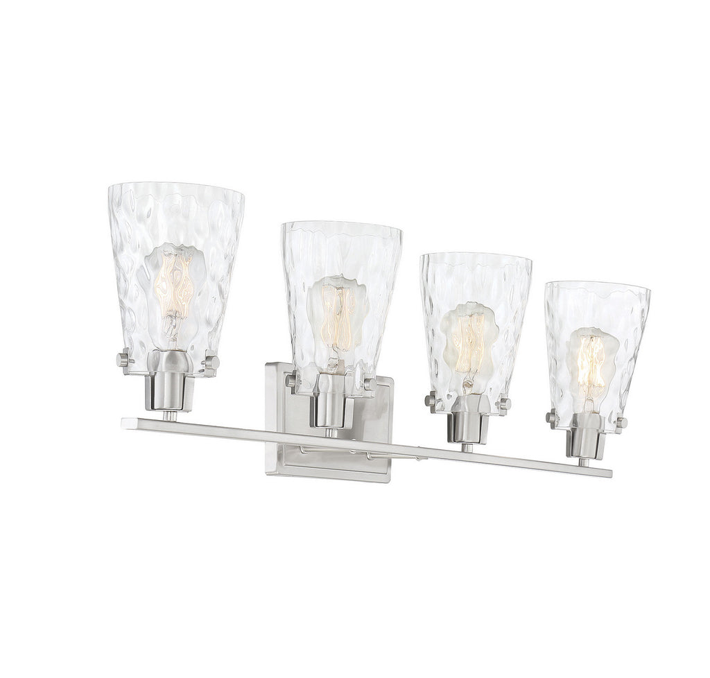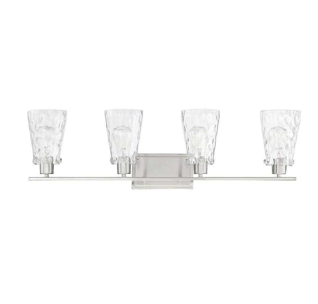If you want a fresh, elegant lighting look in your bathroom, the Savoy House Vaughan 4-light bath bar is the perfect choice. Its sleek design showcases tall fluted shades of clear water glass that are held snugly in place with clasps and screws. The satin nickel finish works beautifully with many different colors of bathroom furnishings and hardware. This fixture is 32.5" wide and 9.25" tall. It extends 6" from the wall. Uses 4 standard size bulbs of up to 60 watts each (not included).
