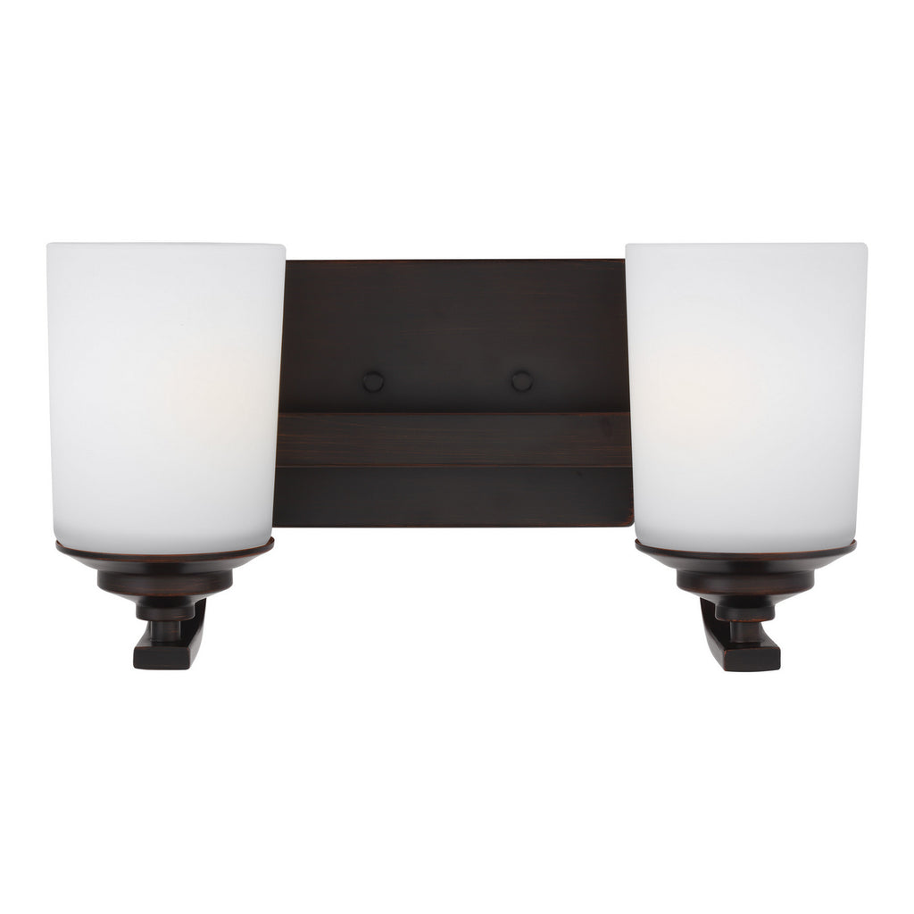 The Kemal two light vanity fixture in bronze offers shadow-free lighting in your powder room, spa, or master bath room.