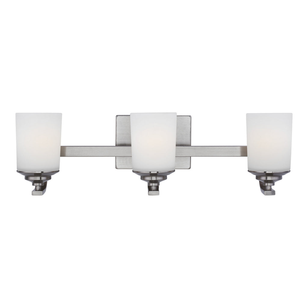 The Kemal three light vanity fixture in brushed nickel offers shadow-free lighting in your powder room, spa, or master bath room.