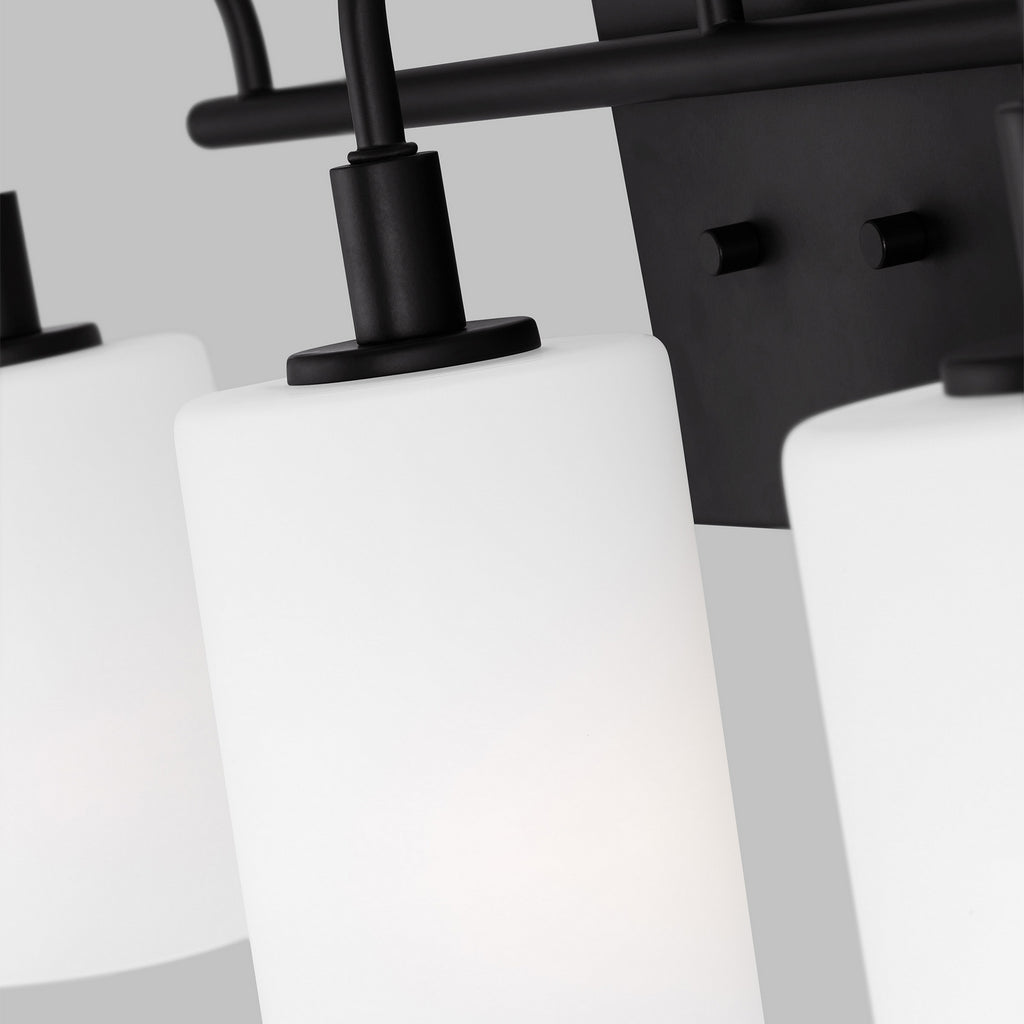 Oak Moore is a universal vanity series available in four finishes. Curved bar detail and etched white shade give it a transitional look.  Install the light with glass shades up or down to light up every corner of your room. The shades are made of Etched White glass to cast a soft light throughout your vanity area.