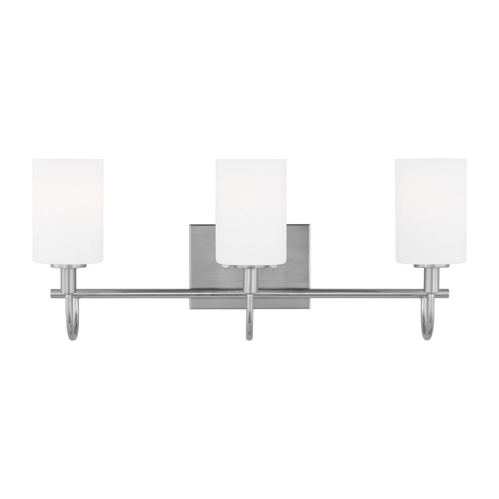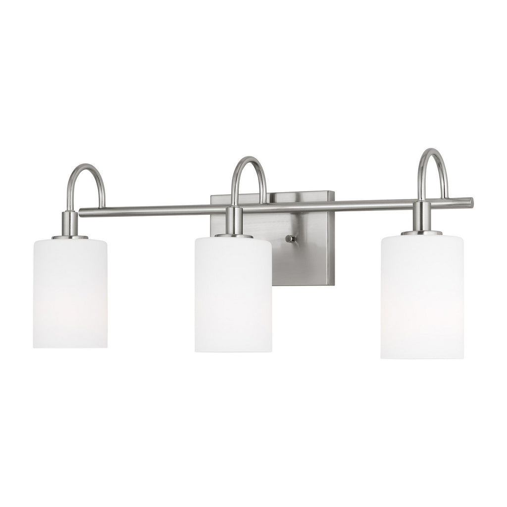 Oak Moore is a universal vanity series available in four finishes. Curved bar detail and etched white shade give it a transitional look.  Install the light with glass shades up or down to light up every corner of your room. The shades are made of Etched White glass to cast a soft light throughout your vanity area.