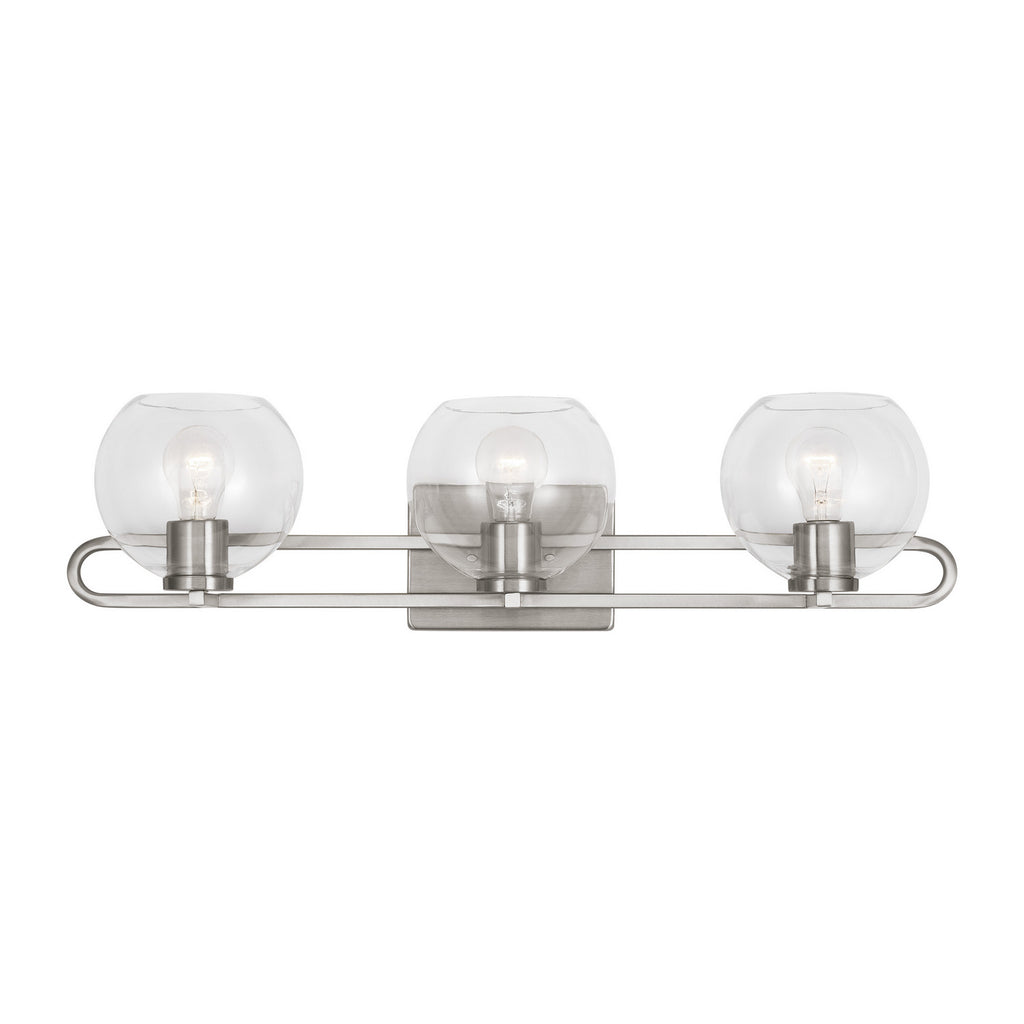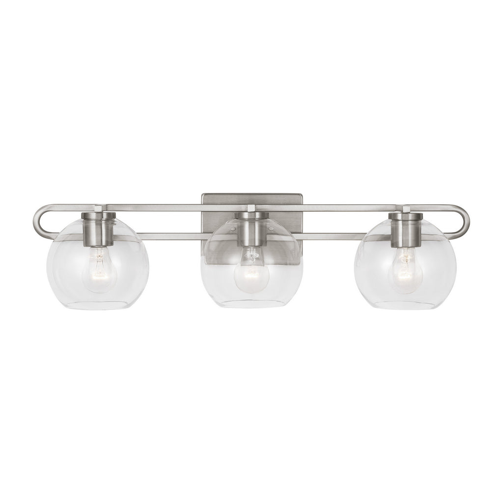 The Codyn three light vanity fixture in brushed nickel silver is a contemporary take on a classic mid-century design. Clear glass shades with open-ended spheres accent the elongated keyhole strap detail, for a clean look. This minimalist collection relies on subtle details to create visual interest​