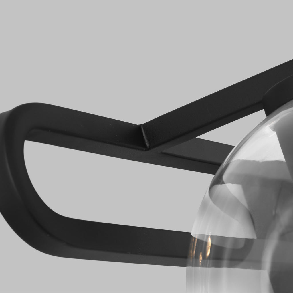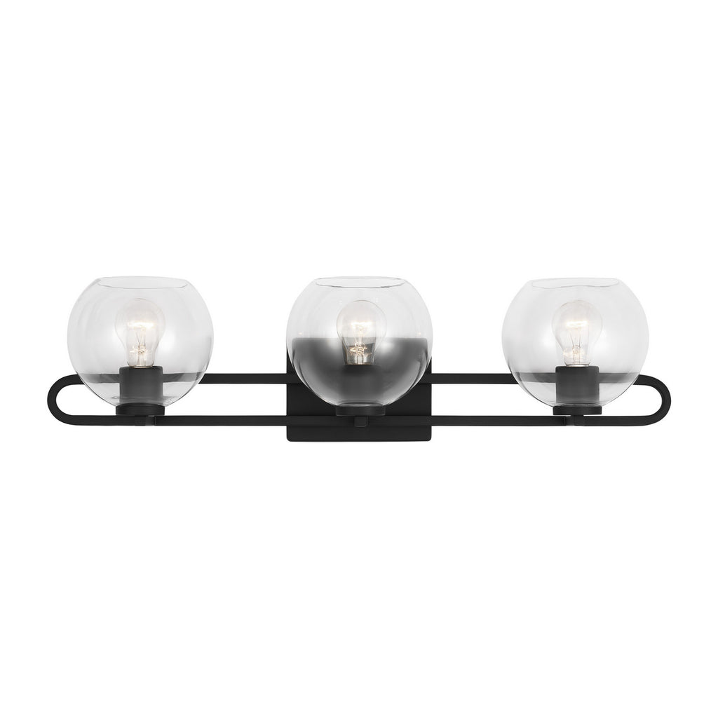 The Codyn three light vanity fixture in Midnight Black is a contemporary take on a classic mid-century design. Clear glass shades with open-ended spheres accent the elongated keyhole strap detail, for a clean look. This minimalist collection relies on subtle details to create visual interest​