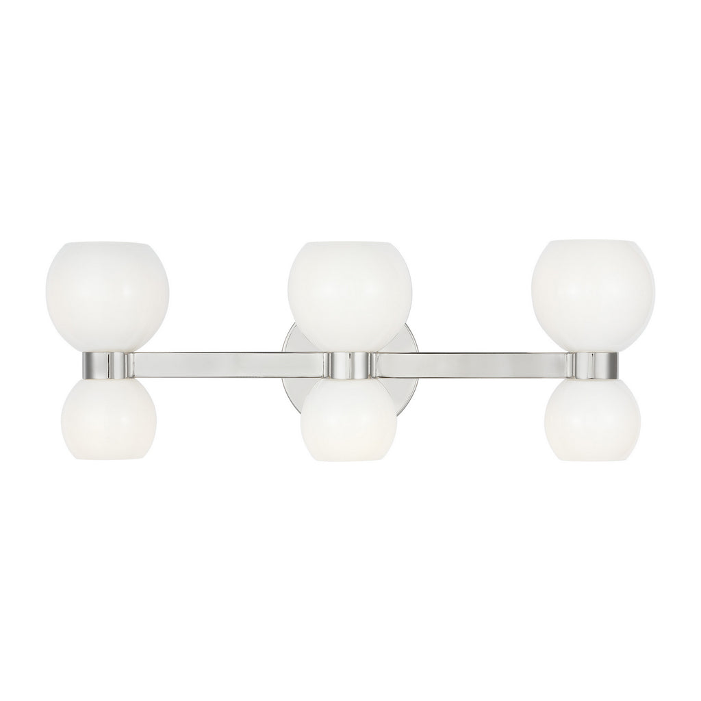 Londyn is inspired by geometric playful midcentury fixtures in metal and glass with exciting profiles and scale play. Six glass spheres with a simple metal cuff and a single bulb—an elegant pendant with graphic interest. This light can fit perfectly into both modern and transitional spaces alike. Available in Burnished Brass and Plashed Nickel finish.