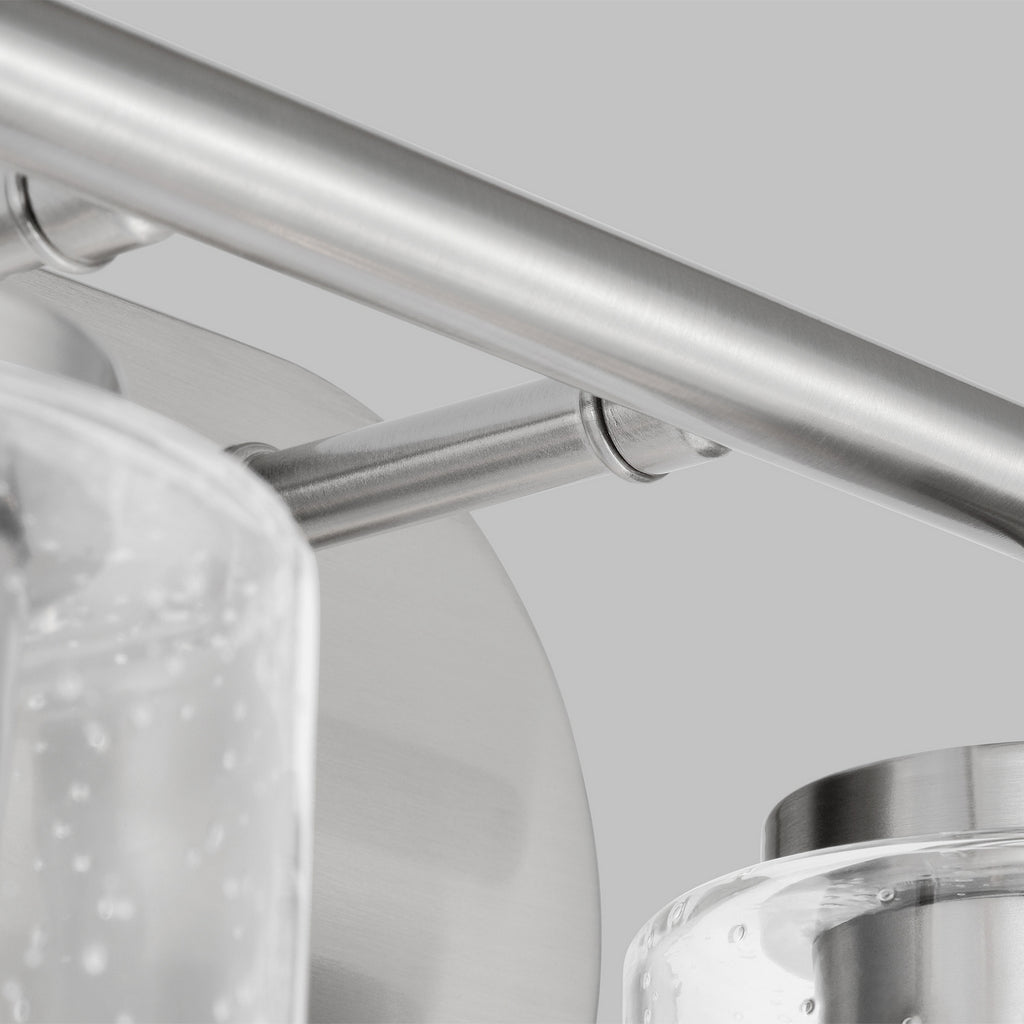 The Oslo two light vanity fixture in Brushed Nickel offers shadow-free lighting in your powder room, spa, or master bath room. The Oslo lighting collection by is a sleek design, with smooth and clean lines. The Clear Seeded glass adds to this collection's contemporary and minimalist character. Offered in Chrome, Brushed Nickel, Bronze and Midnight Black finishes, the collection includes nine-, five-, and three-light chandeliers, mini pendant, both flush and semi-flush ceiling fixtures, as well as one-, two-, three- and four-light wall/bath fixtures. Both incandescent lamping and ENERGY STAR-qualified LED lamping are available. All fixtures are California Title 24 compliant.