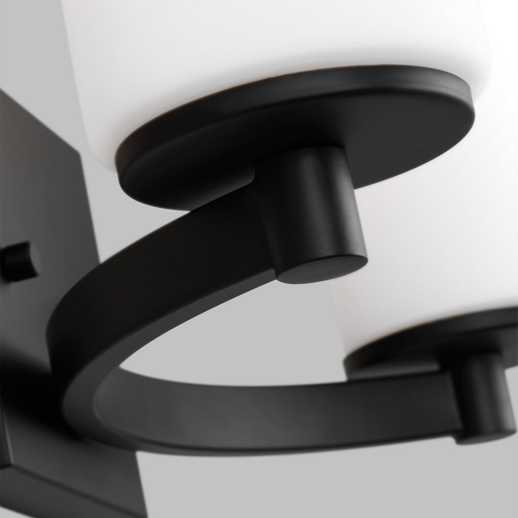 The Hettinger two light vanity fixture in Midnight Black provides abundant light for your bath vanity, while adding a layer of today's style to your interior design. The Hettinger lighting collection by combines a traditional look with chic, modern charm. The minimalism of the tubular glass shades balances with the unique, outward-curve of the semi-circular arm detail. Hettinger is available in three finishes - Bronze and Brushed Nickel for the whole collection, and Chrome, Midnight Black and Satin Brass for the bath vanities. The assortment includes six- and nine-light chandeliers, a one-light wall sconce, two-, three- and four-light bath vanity fixtures, a three-light pendant and two- light semi-flush convertible pendant. Incandescent and ENERGY STAR-qualified LED lamping are available, all fixtures are California Title 24 compliant.