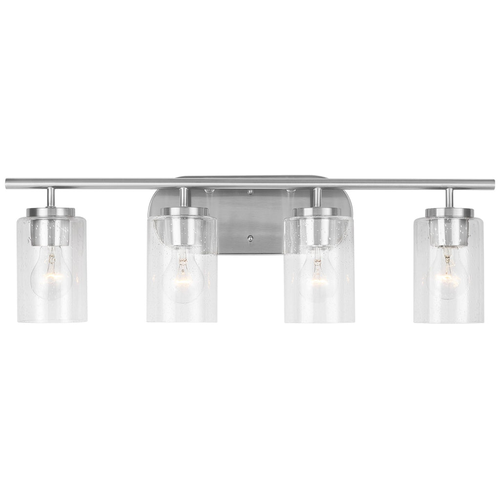 The Oslo four light vanity fixture in Brushed Nickel offers shadow-free lighting in your powder room, spa, or master bath room. The Oslo lighting collection by is a sleek design, with smooth and clean lines. The Clear Seeded glass adds to this collection's contemporary and minimalist character. Offered in Chrome, Brushed Nickel, Bronze and Midnight Black finishes, the collection includes nine-, five-, and three-light chandeliers, mini pendant, both flush and semi-flush ceiling fixtures, as well as one-, two-, three- and four-light wall/bath fixtures. Both incandescent lamping and ENERGY STAR-qualified LED lamping are available. All fixtures are California Title 24 compliant.