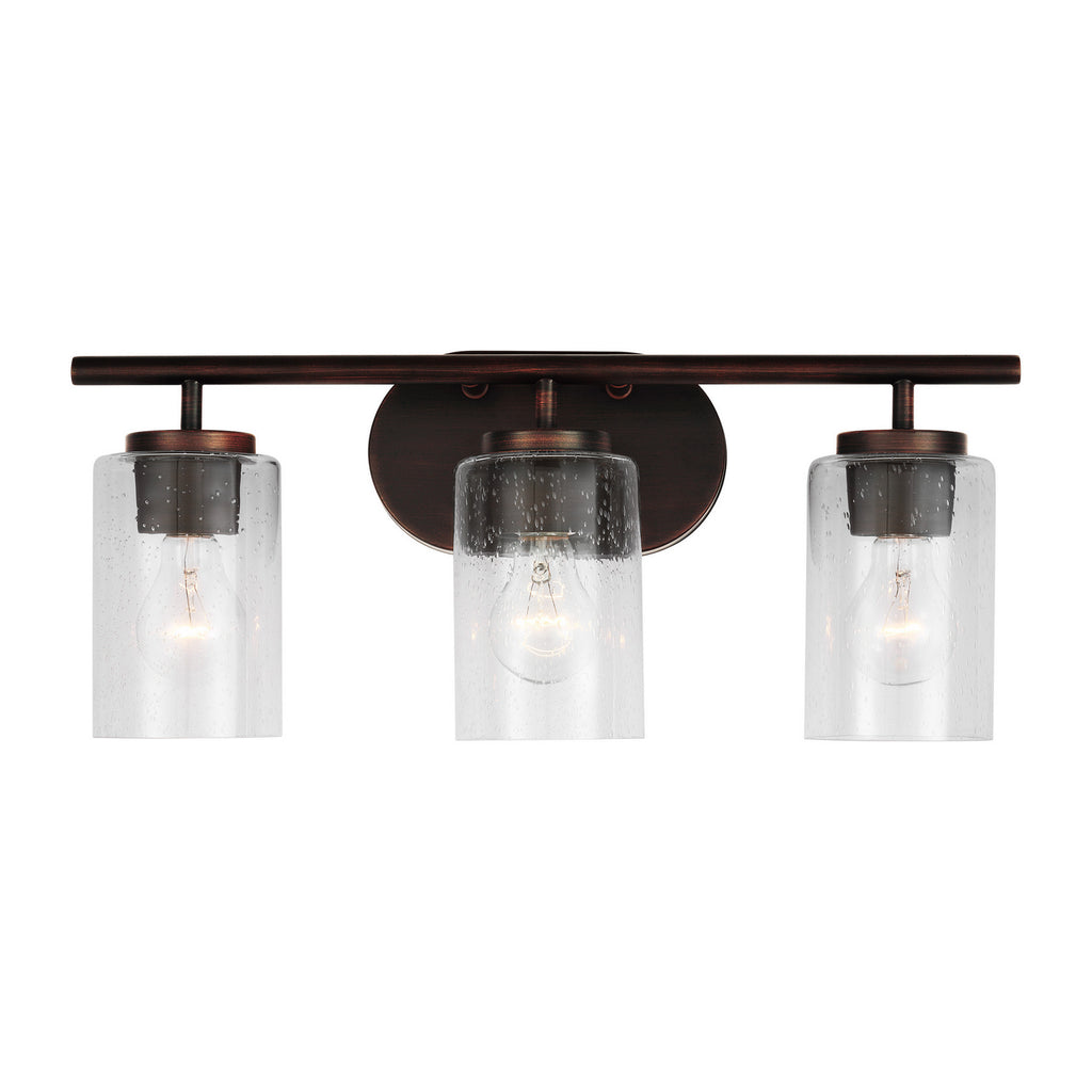 The Oslo three light vanity fixture in Bronze offers shadow-free lighting in your powder room, spa, or master bath room. The Oslo lighting collection by is a sleek design, with smooth and clean lines. The Clear Seeded glass adds to this collection's contemporary and minimalist character. Offered in Chrome, Brushed Nickel, Bronze and Midnight Black finishes, the collection includes nine-, five-, and three-light chandeliers, mini pendant, both flush and semi-flush ceiling fixtures, as well as one-, two-, three- and four-light wall/bath fixtures. Both incandescent lamping and ENERGY STAR-qualified LED lamping are available. All fixtures are California Title 24 compliant.