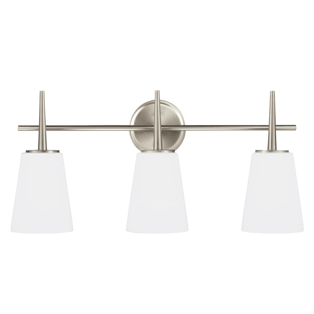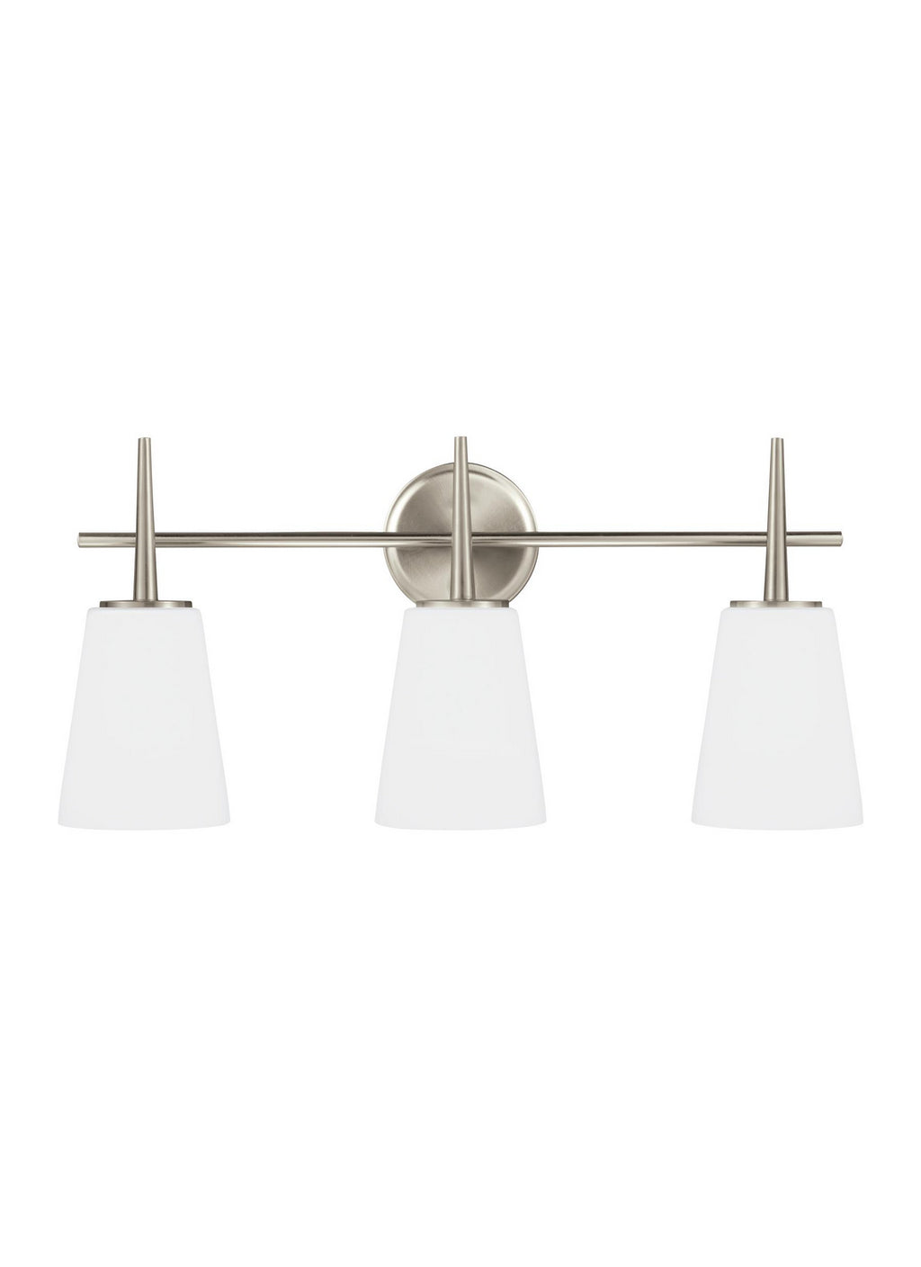 The Driscoll three light vanity fixture in brushed nickel offers shadow-free lighting in your powder room, spa, or master bath room. The 1960âs-inspired Driscoll collection by features the clean lines of tapered stems and glass shades. Simplicity combined with sophistication creates this strikingly modern look. Offered in a Brushed Nickel finish in addition to the Chrome finish also offered for wall/bath fixtures all of which feature Etched White glass shades. The assortment includes nine-light, five-light and three-light chandeliers, a mini pendant, as well as one-light, two-light, three-light and four-light wall/bath fixtures. Both incandescent lamping and ENERGY STAR-qualified LED lamping are available, all fixtures are California Title 24 compliant.