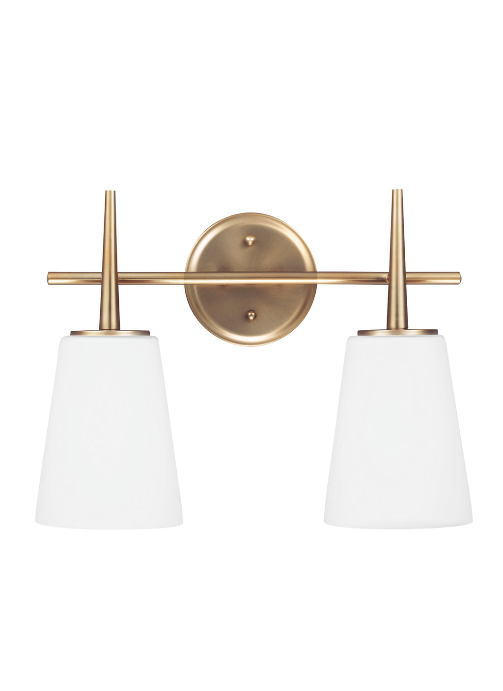 The Driscoll two light vanity fixture in satin brass offers shadow-free lighting in your powder room, spa, or master bath room. The 1960âs-inspired Driscoll collection by features the clean lines of tapered stems and glass shades. Simplicity combined with sophistication creates this strikingly modern look. Offered in a Brushed Nickel finish in addition to the Chrome finish also offered for wall/bath fixtures all of which feature Etched White glass shades. The assortment includes nine-light, five-light and three-light chandeliers, a mini pendant, as well as one-light, two-light, three-light and four-light wall/bath fixtures. Both incandescent lamping and ENERGY STAR-qualified LED lamping are available, all fixtures are California Title 24 compliant.